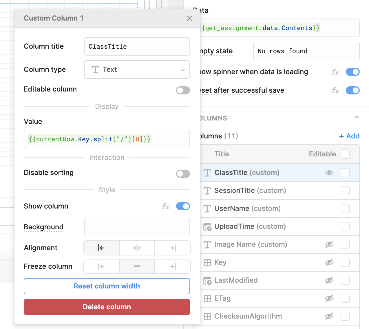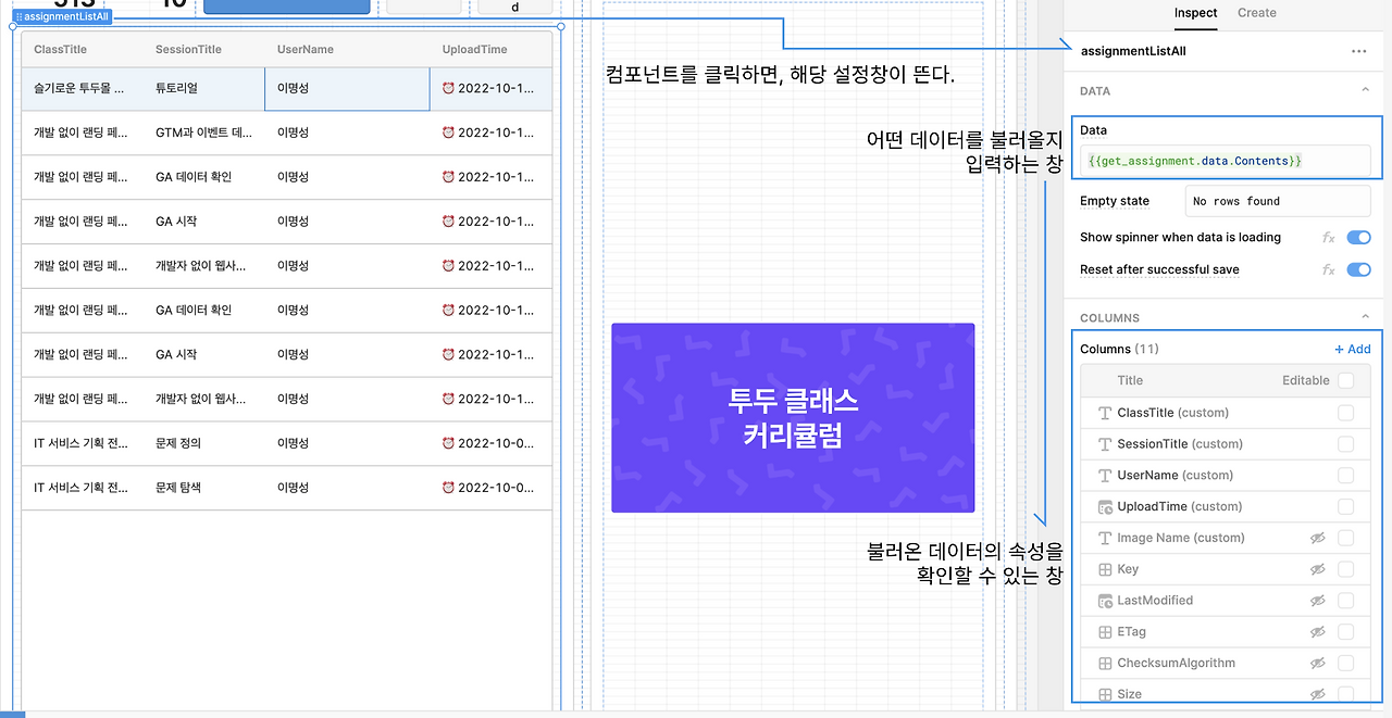 아래 [Data] 입력란에 {{get_assignment.data.Contents}}라고 적혀있는데, 이는 "get_assignment"라는 리소스 쿼리의 결과값에서 "data" 안에 있는 "Contents" 데이터를 불러오겠다는 의미다. 그 결과, Contents에 저장된 array 데이터가 호출됐고, [CULUMNS] 영역에서 해당 데이터 속성이 보이는 걸 확인할 수 있다.