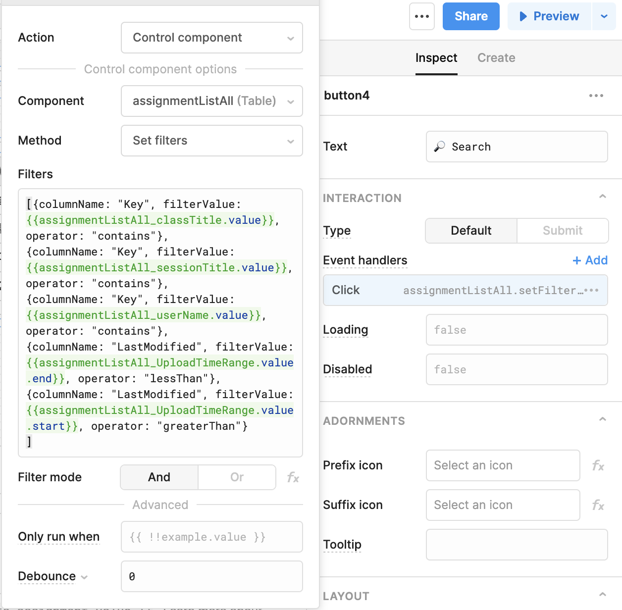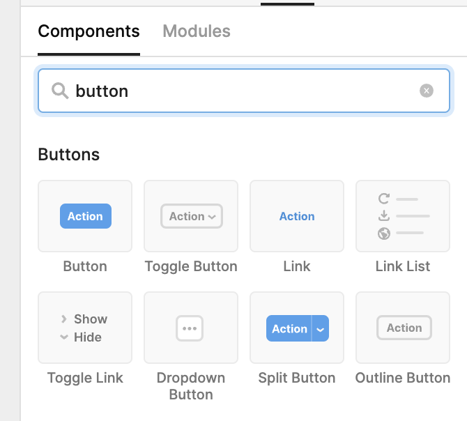 S3에서 모든 데이터를 불러와 조회할 수 있게 됐으니, 마지막으로 필터 기능을 구현할 차례다. 이를 위해 (1) 필터 값을 입력할 input 컴포넌트와 (2) 테이블에 필터를 적용시킬 Button 컴포넌트가 필요하다. 리툴에서 지원해주는 UI 컴포넌트 중에서 Button type이 있다. Button type의 컴포넌트는 클릭 시, 특정 액션을 작동시키도록 설정할 수 있다.