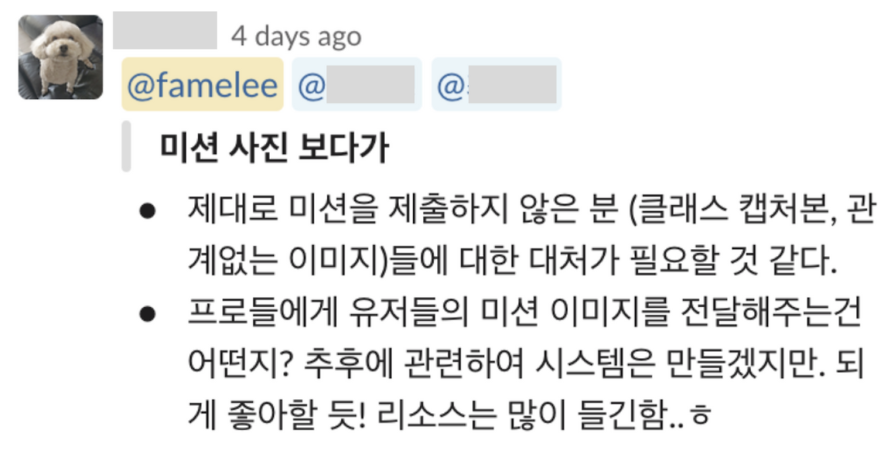 앞서 말했듯, 초기 창업팀에게 속도가 중요하다. 최근에 운영을 시작한 클로즈 베타 앱도 최소 기능만을 담아낸 서비스였고, 다른 부분에 리소스를 쏟을 여유가 없었다. 그렇기에, 유저가 미션을 성공적으로 완수하고 있는지 파악할 수 있는 어드민 시스템을 만들지 못했다. 선견지명으로 개발자가 미션 인증 사진을 AWS의 S3에 업로드 되도록 만든 덕분에, 클래스별 미션 사진을 조회할 수 있었다. 다만, S3 링크를 하나하나 클릭해서 봐야 했기에 리소스가 어쩔 수 없이 들어갔다.