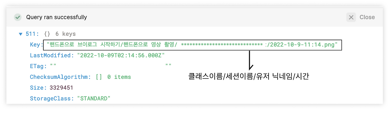 Contents에 저장된 array 데이터를 클릭하면 아래처럼 나온다. 여기서 Key는 S3에 저장된 데이터 이름을 뜻한다. 우리 개발자는 유저가 미션을 인증할 때, S3에 {클래스 이름}/{세션 이름}/{유저 닉네임}/{시간}. png 이름으로 데이터가 저장되게 설정했기에, Key 값이 아래처럼 나왔다.
