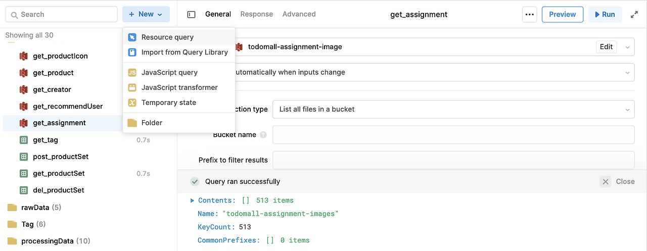 데이터 설정 패널에서 등록한 리소스를 쿼리로 호출해서 사용할 수 있다. 데이터 설정 패널에서 (1) 리소스 쿼리를 새로 추가한 후, (2) [Resource] 선택란에서 리소스 대상을 선택하고, (3) [Action Type] 선택란에서 리소스를 어떻게 작동시킬지 고르면 된다. 아래 이미지를 보면 리소스 대상으로 앞서 설정한 S3의 리소스를 선택했고, 액션으로 모든 파일을 불러오는 걸 택했다. 그 결과, 하단처럼 데이터가 호출됐으며, Contents 안에 S3 데이터가 array 형식으로 모두 담겨있다.