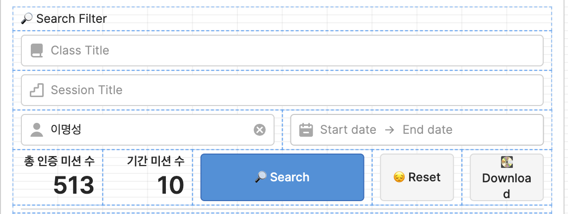 이렇게까지 하면, 처음에 설정한 기능 범위인 (1) S3 데이터를 어드민 페이지로 불러온 후, (2) 필터를 적용해 (3) 데이터를 조회하는 기능이 모두 구현 완료됐다. 이런 간단한(?) 조작으로 어드민 페이지를 하루 만에 구현 가능할 수 있었다. 물론 구현하려는 프로덕트의 난도가 높거나, 코드 자체를 몰라서 서칭하는 경우에 시간이 더 걸릴 수 있다. 이거 다음에 구현한 클래스 개설 시스템은 복잡해서 3일 정도 소요됨... 다만, 이런 노코드 툴을 알고 있다면, 개발 의존성에서 벗어날 수 있으며 결과적으로 팀이 나아가는 속도가 더 빨라질 것이라 확신한다!