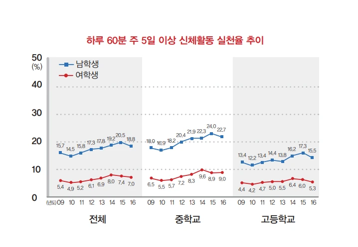 청소년 건강행태 온라인 조사에 따르면 2016년 현재 주 3일 이상 격렬한 신체활동을 하는 학생은 전체 학생의 약 1/3 정도로 나타나고 있습니다. 특히 중학교 1학년에서 고등학교 3학년으로 올라갈수록 그 비율은 48%에서 28%까지 감소하는 것으로 나타나고 있습니다. 그리고 하루 60분 이상 주 5일 이상 신체 활동을 하는 학생들의 분포를 보면 남자 학생은 18.8%로 나타나고 있으며, 여학생들의 신체활동은 약 7%로 남학생들의 절반에도 미치지 못하고 있습니다. 그리고 또 다른 조사항목을 보면 우리 아이들이 학습 목적으로 앉아서 보낸 시간은 2013년 이후로 주중과 주말 모두 지속적으로 증가하는 경향을 보이고 있습니다. 이처럼 건강을 위한 신체활동을 하는 시간은 줄어들고 있으며, 공부를 위해 앉아있는 시간은 계속 증가하고 있는 것이 우리 아이들의 현재 모습입니다.