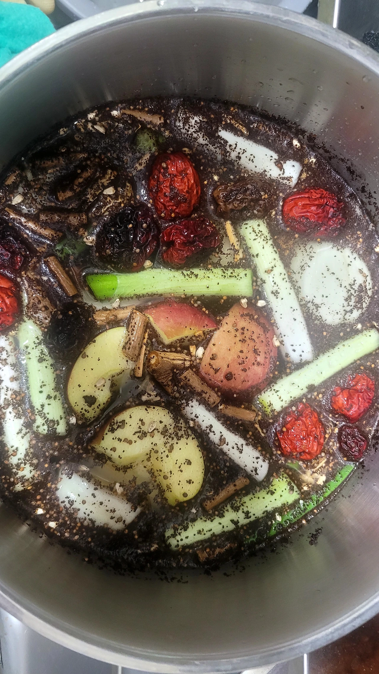 삼겹살 +된장+마늘+다시마+대파+양파+홍화씨+오가피+소주 +
