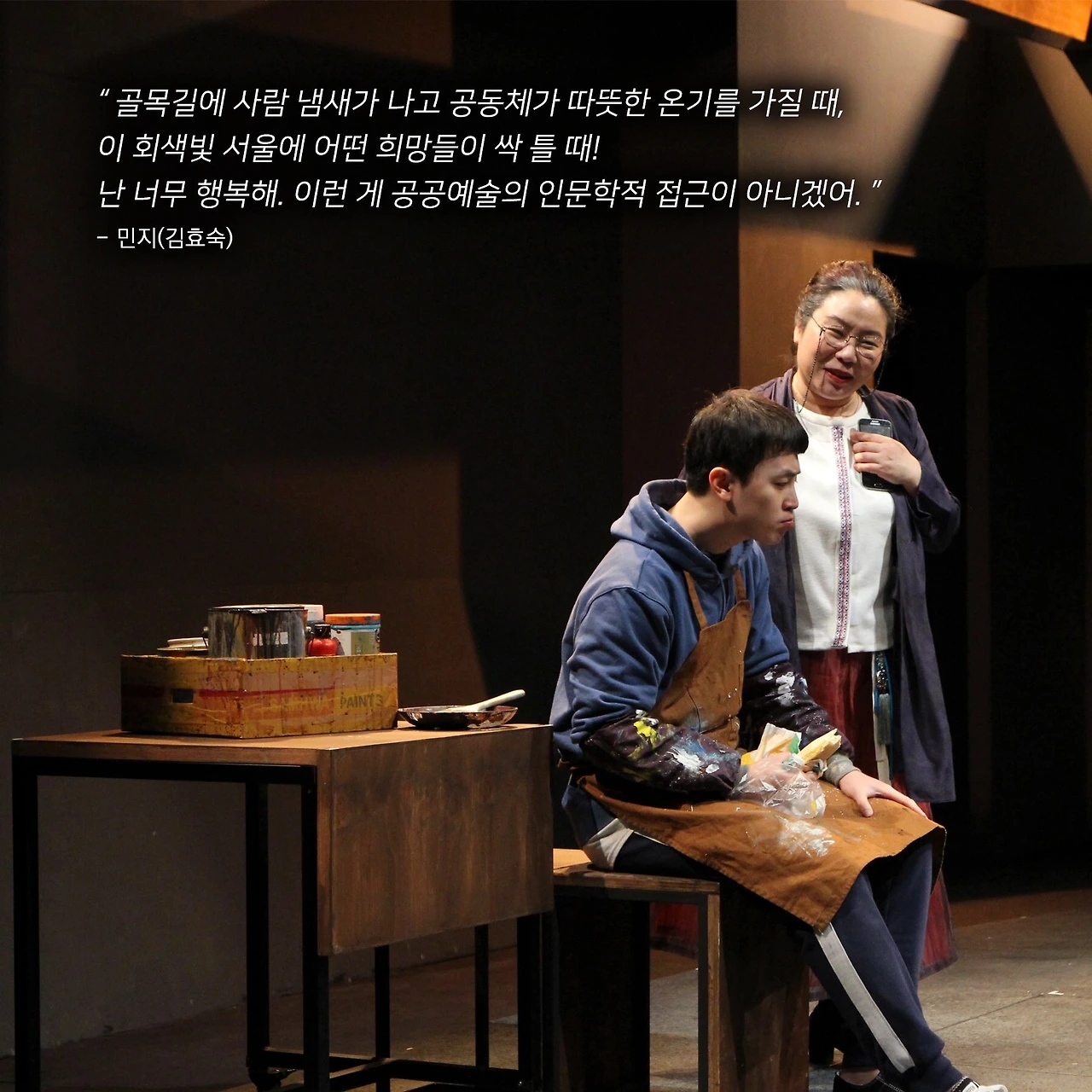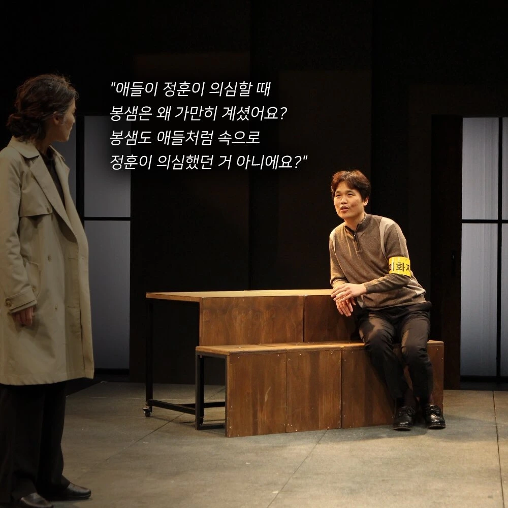 관객들은 순자와 임대 아파트 아이들의 편에서 극을 관람하게 된다. 그럼 나머지 인물들은 악역인 걸까? 그렇지 않다. 이 극에는 선역도 악역도 없다. 극이 다루는 사회 문제 안에서 그 누구도 가해자가 되지 못한다. 모두가 피해자다. 현 사회 구조는 인간들을 아파트의 노예로 만들었다. 연극 <철가방 추적 작전>은 우리에게 노예 문서를 확인시켜 주었다. 문서를 태울 불씨를 만드는 것은 이제 우리 모두의 몫이다.