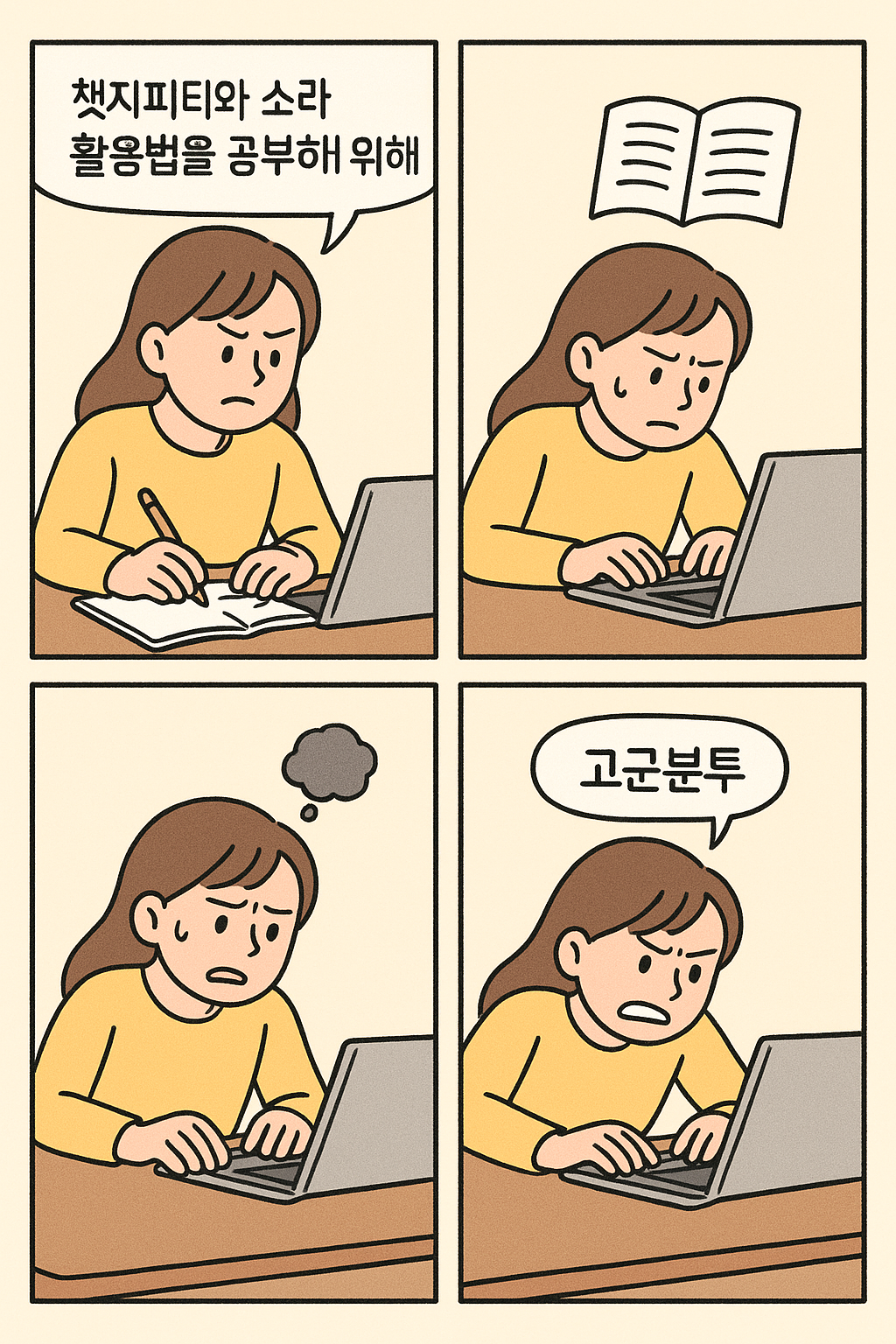"챗GPT와 소라 활용법을 공부하기 위해 고군분투하는 작가지망생 4컷 만화를 그려줄 수 있어?"