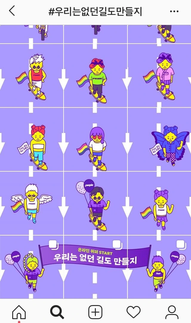 사실 퀴어퍼레이드에 가본적은 없다. 하지만 늘 SNS를 통해서 행사사진을 접하곤 했다. (feat. 기독교 반대세력) 그런데 올해는 코로나때문에 퍼레이드가 열리지 않는 모양이다. 이 위기를 기회삼아 또 이렇게 트렌디한 참여이벤트를 기획해내다니... 손안에서 스크롤을 내리노라면 정말이지 사람들이 움직이며 앞으로 나가는 느낌이 들더라. 감탄이 멈추지 않았다.
