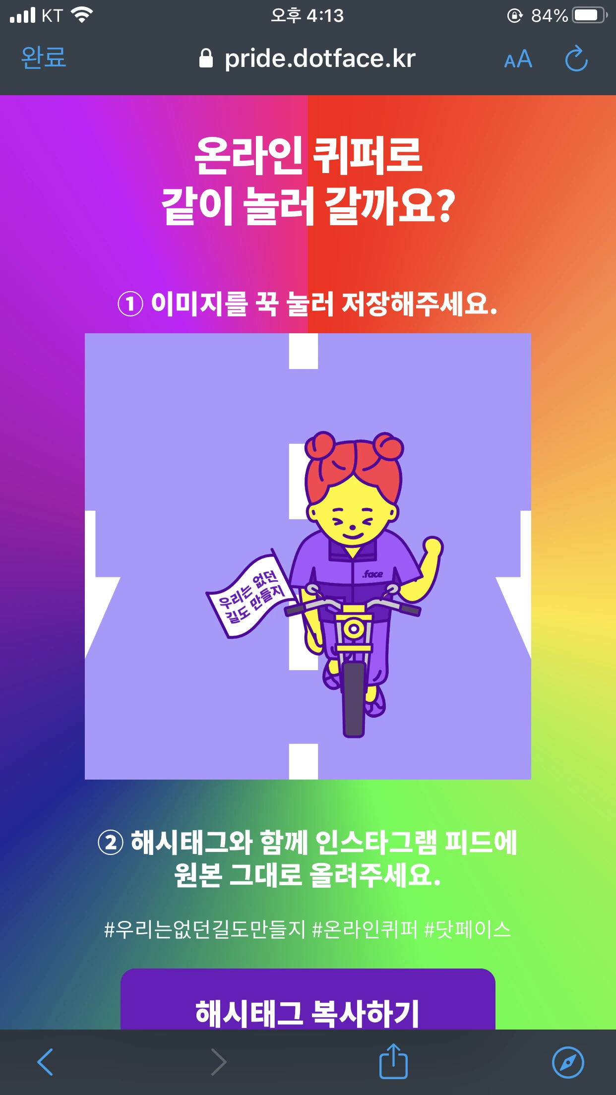'우리는 없던길도 만들지' 라는 카피도 얼마나 인상적인지. 개인적으로 올해 봤던 디지털캠페인 중 베스트로 손꼽고싶다. 쉬운 참여, 인스타에 공유할만한 이미지, 의미있는 메시지. 뭐하나 빠지는게 없다. 코로나시대의 디지털캠페인. 덕분에 나도 처음으로 퀴어퍼레이드에 참여했다. 닷페이스 당신들은 도대체... 기획의 힘이 정말 크다. 아이디어는 게으른 방관자도 움직이게 한다.