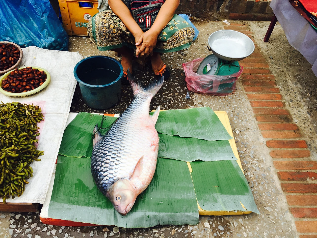 탁발을 마친 후, 아침 시장을 구경 가기 위해 메콩강을 따라 걸었다. 새벽이라 고요한 분위기가 물씬 풍기는 메콩강변의 모습에 조금씩 안정을 찾아갈 무렵, 아침 시장의 시작점에 도착했다. 한창 장사가 시작되려는지 곳곳에서 좌판이 펼쳐지고 있었다. 아침 시장의 초입부터 엄청난 크기의 물고기가 내 시선을 사로잡았다. 마치 월간 낚시에 나올 것 같은 비주얼의 물고기. 크다. 정말 크다. 물고기만 큰 게 아니라 다른 것들도 다 사이즈가 컸다. 새 종류를 다리를 묶어놓은 채 팔기도 했는데, 새를 무서워하는지라 주빈이의 뒤에 숨어 겁쟁이처럼 새를 파는 코스를 지났다. 묶어놨지만 계속 푸드덕거려서 나한테 날아올 것만 같은 느낌이라 무서웠다. 아침 시장은 식자재 위주로 판매했기에 우리가 딱히 살 건 없어서 금세 한 바퀴를 돌았다.