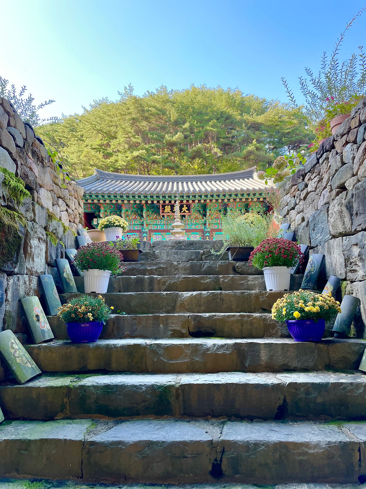 문수암으로 들어가는 입구는 짧은 길이었지만, 가을의 냄새가 물씬 풍겼다. 왼쪽으로는 개울이 흐르고, 오른쪽으로는 울창하게 우거진 산의 풍경이 보이는 게 좋았다. 경내로 진입하는 계단 또한 매력적이었다. 계단의 양쪽에 꽃들로 꾸며진 화분이 놓여져 있어서 예쁘다는 생각이 절로 들었다.