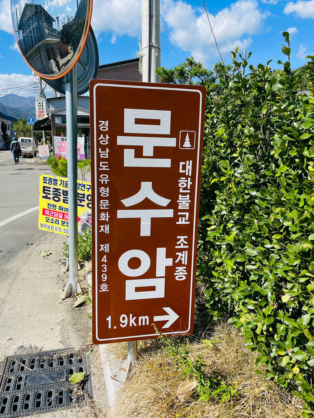 마치 시내버스처럼 산청의 이곳저곳에서 사람들을 내려주던 버스는 1시 25분에 나를 사리마을에 내려주었다. 사리마을 정류장에 내리자 문수암으로 향하는 표지판이 나를 반겼고, 나는 표지판을 따라 천천히 걷기 시작했다.
