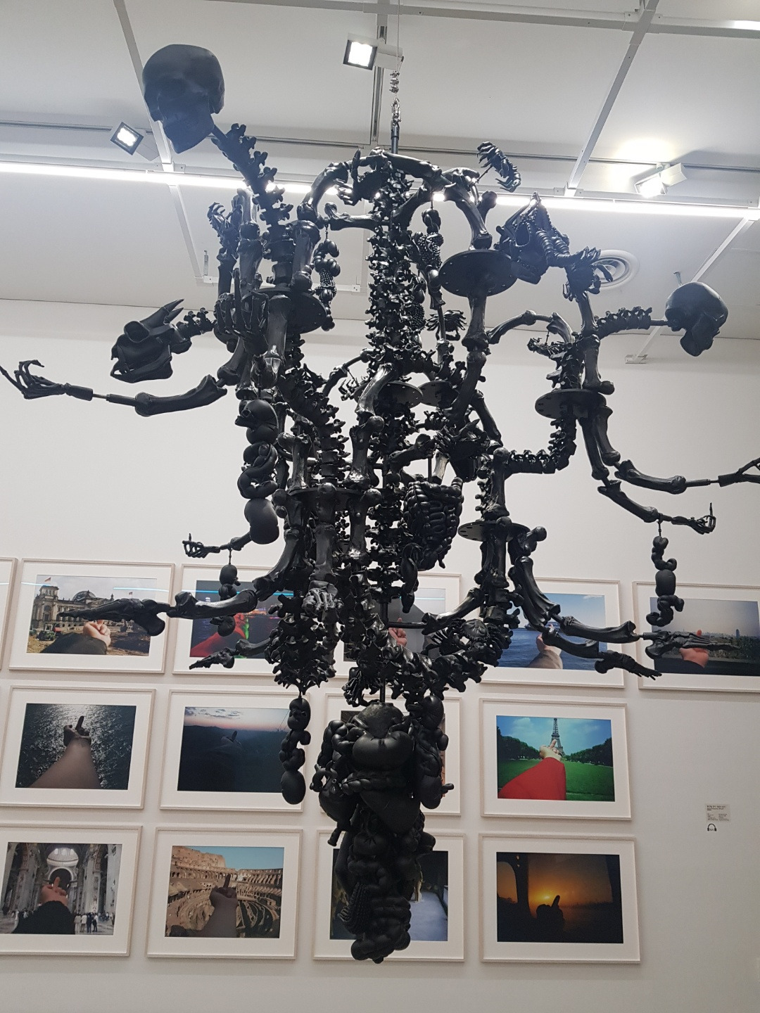 전시장을 처음 들어서면 제일 먼저 관람객을 반기는 작품이 있다. 유리로 만들어진 검은색 샹들리에다. 검은 샹들리에는 사람과 동물의 뼈와 내장으로 구성되어 있는데 이것들은 뒤섞여 어느 것이 사람의 것인지 구별할 수 없다. 검게 칠해진 무광 샹들리에는 그냥 보아서는 유리라는 소재를 알 수 없다. 적힌 글을 읽어야 유리임을 인지한다. 그런데 이상한 점이 또 있다. 이 샹들리에에는 원래 기능인 전구나 초를 켤 수 있는 곳이 없다. '왜 샹들리에는 빛나지 않으며 동물과 사람을 구별할 수 없을까?'라는 질문을 던지며 전시가 시작된다.