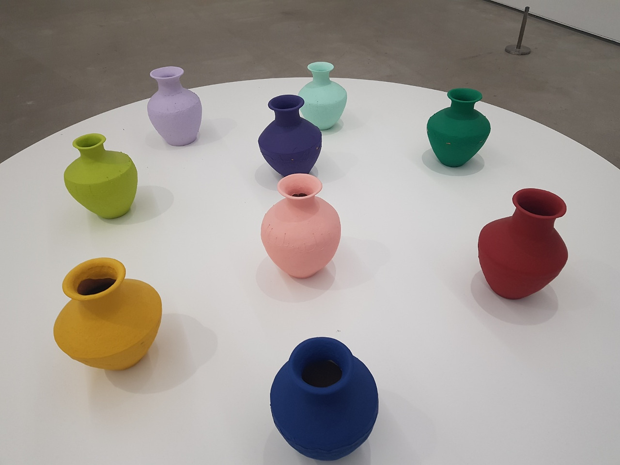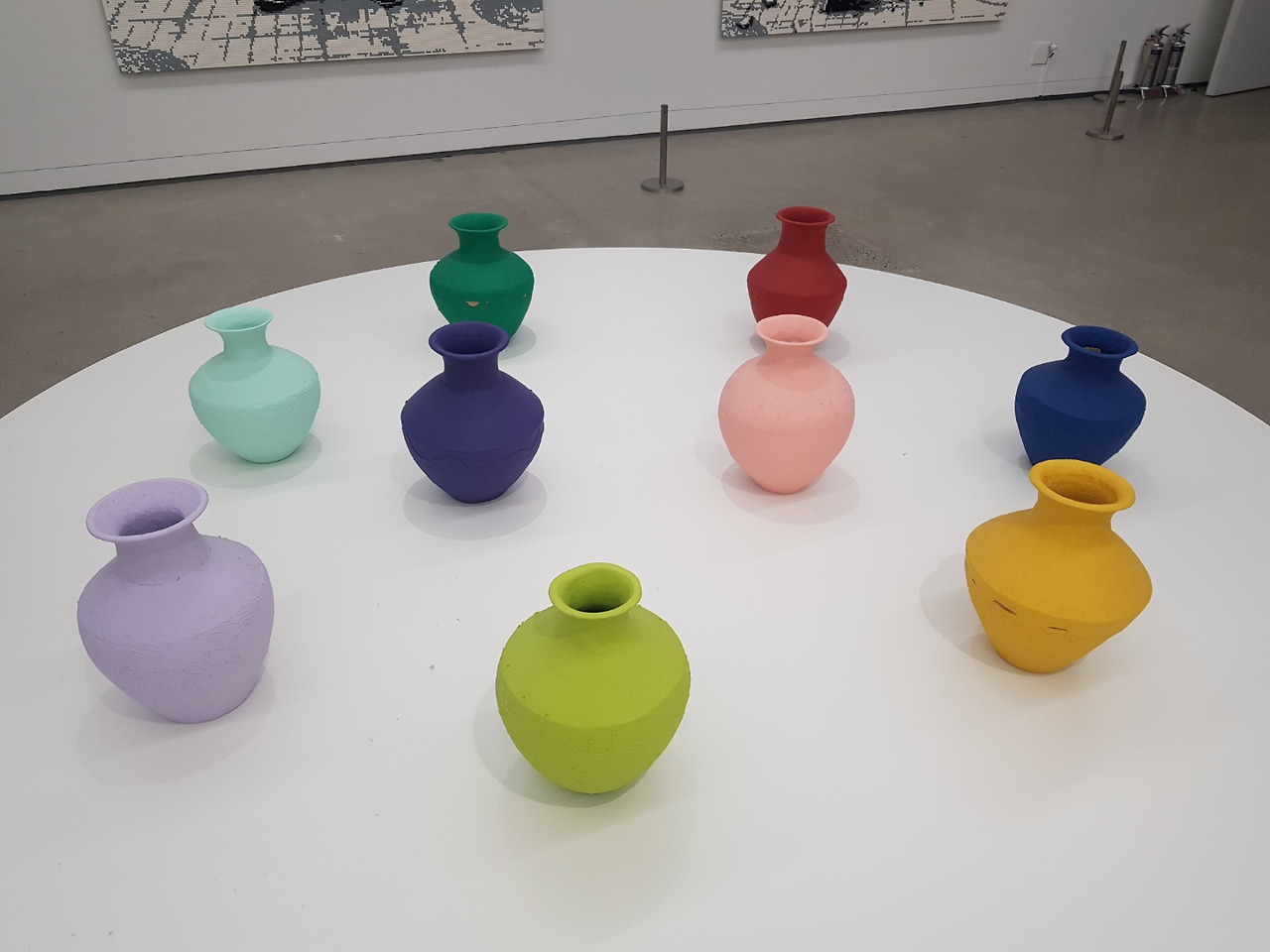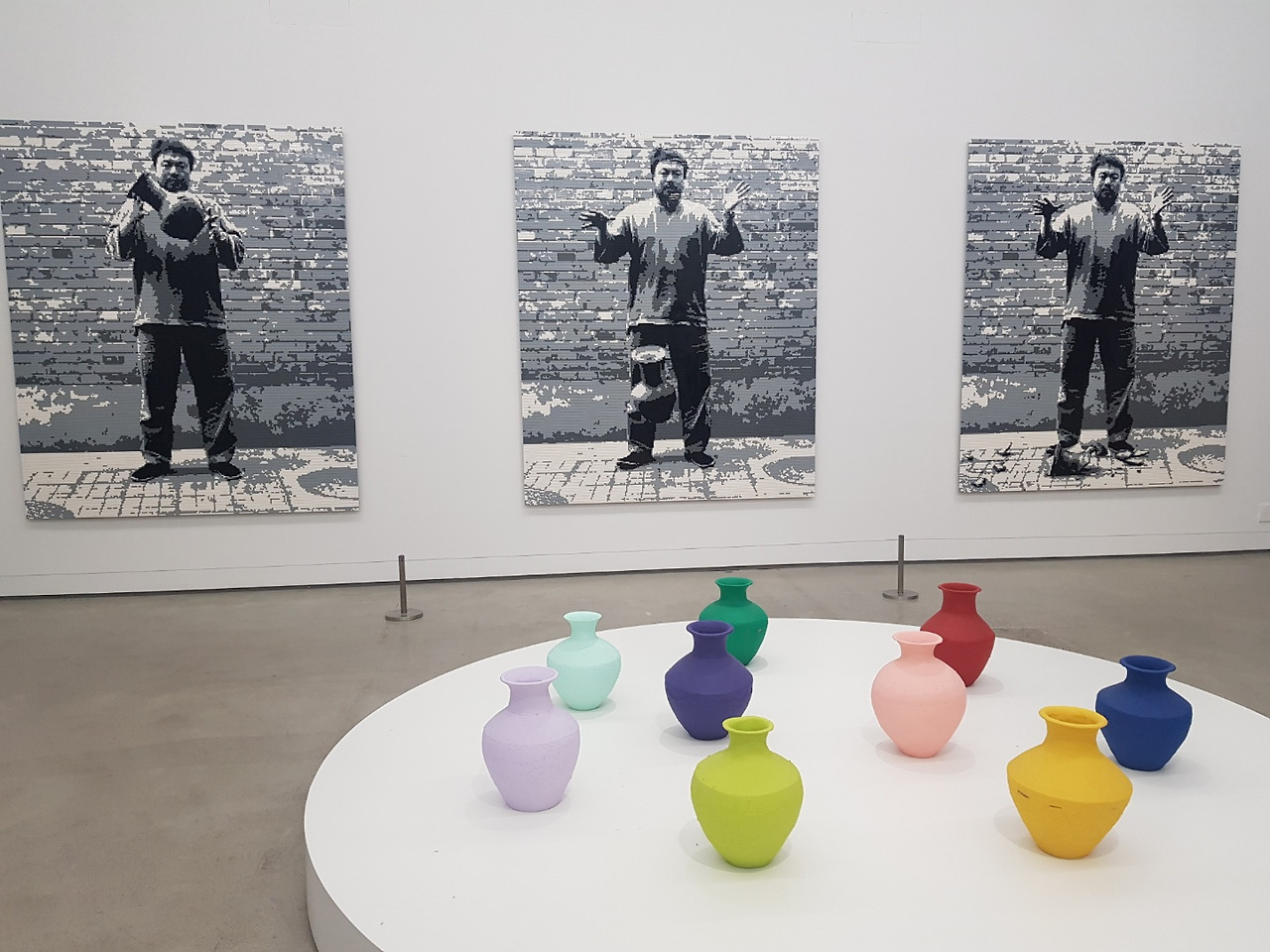 <원근법 연구>는 작가가 여러 나라를 다니며 랜드마크이자 각국이 자랑하는 문화유산 앞에서 중지를 치켜세우는 사진을 연작으로 보여준다. <한대 도자기 떨어뜨리기>와 <색을 입힌 화병들>은 중국사에서 중요하게 다루는 한나라 시대 유물인 도자기를 떨어뜨려 깨뜨리고, 공업용 페인트에 담갔다 뺀다. 멀리서 보면 알록달록 예쁘지만 조금만 가까이 다가가면 유약을 바르듯 섬세함 없이 마구잡이로 발라져 흐르고 빈 부분이 있어 싸구려같이 느껴진다. 순식간에 가치는 숨겨지고 유치해 보인다. 이는 중국의 역사 문화를 다루는 태도에 대해서 말하고 있다. 가치와 맥락에 대한 이해 없이 이뤄진 조급한 현대화, 맹목적인 역사의 우상화 파괴 이는 중국뿐만 아니라 성찰 없이 이룩한 인류의 역사와 문화를 다루는 태도를 부정적으로 바라본다.