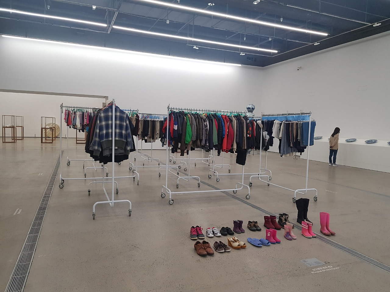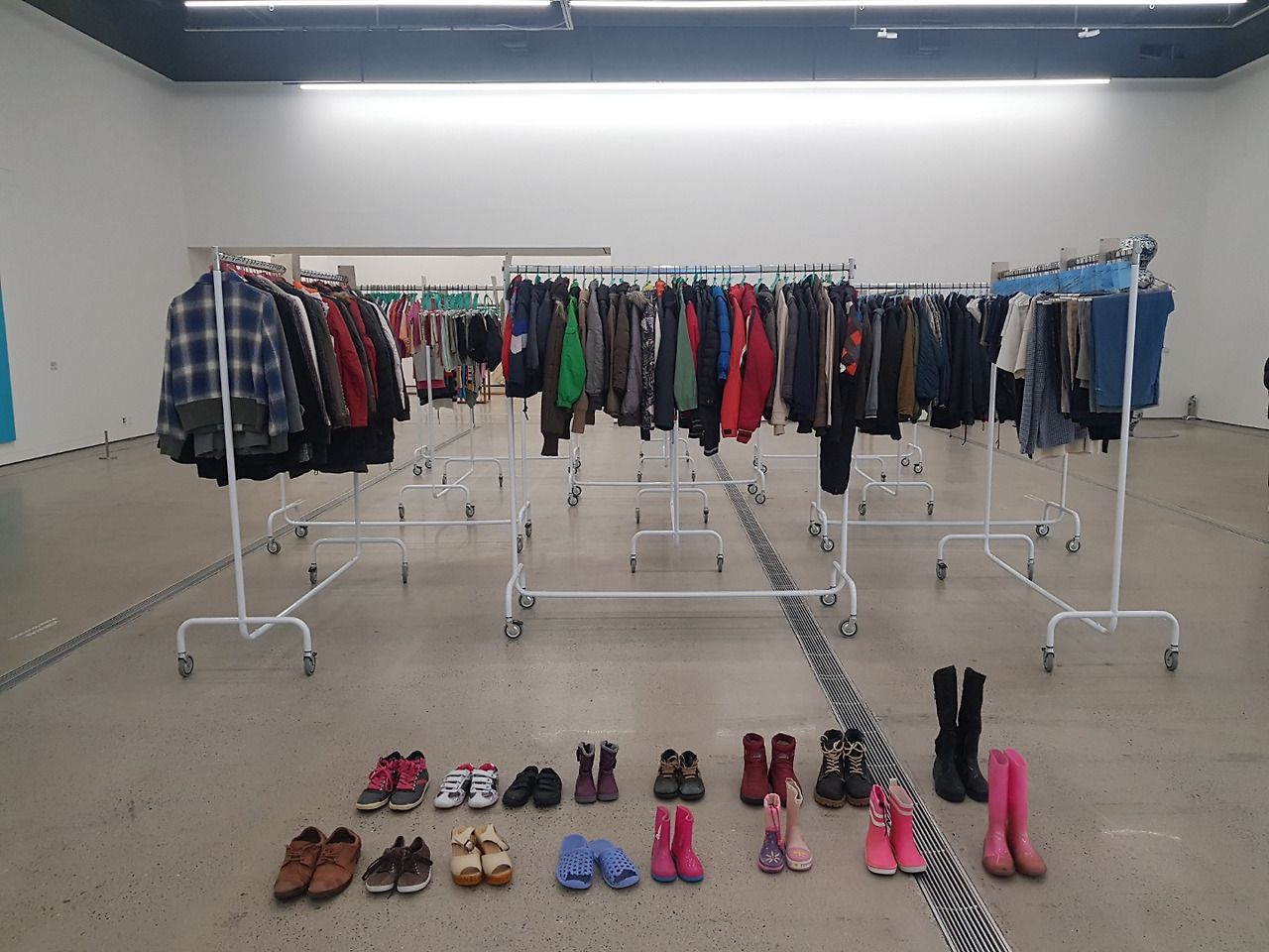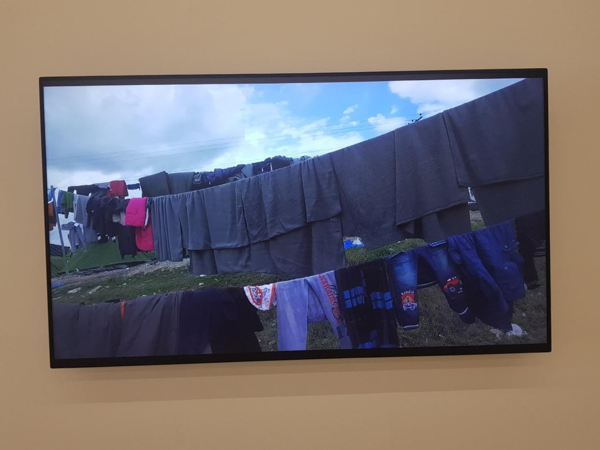 <빨래방>에 널린 빨래들은 그리스와 마케도니아 국경지역의 난민캠프에서 수거한 버려진 옷들과 신발들이다. 우리는 흔히 패션을 자기표현의 수단이라고 한다. 개인은 각자의 개성을 뽐내며 옷으로 스스로를 꾸며 자신이 어떤 사람인지 나타낸다. 이 옷들과 신발들은 난민들의 것이다. 난민들은 계속해서 이동하는 사람들이다. 어쩔 수 없이 경계선에서 떠돌며 방향을 잃고 이동해야만 한다. 내가 어디로 가야 할지 방향을 잃은 사람의 자기표현은 아무리 깨끗하게 세탁하고 반듯하게 다림질을 하더라도 무의미하게 나열될 뿐 쓸쓸해 보인다. 주인을 잃은 빨랫감일 뿐이다. 난민은 그저 비유일 뿐이다. 목적지를 모르는 인간은 난민의 처지와 다를 바 없다.