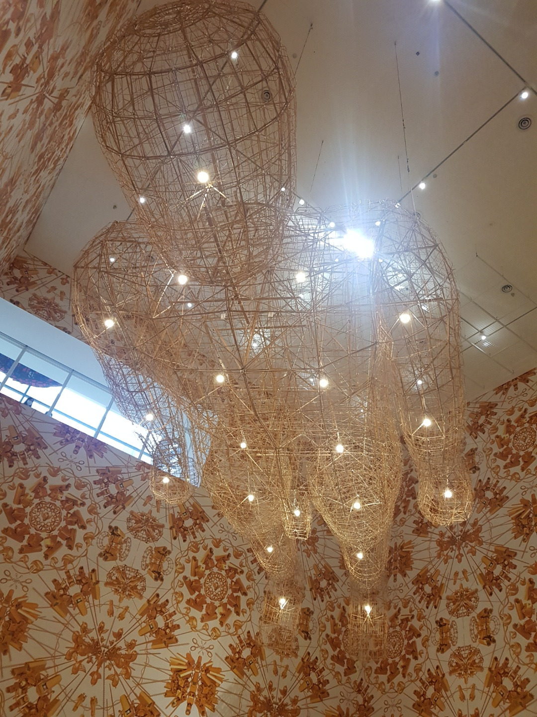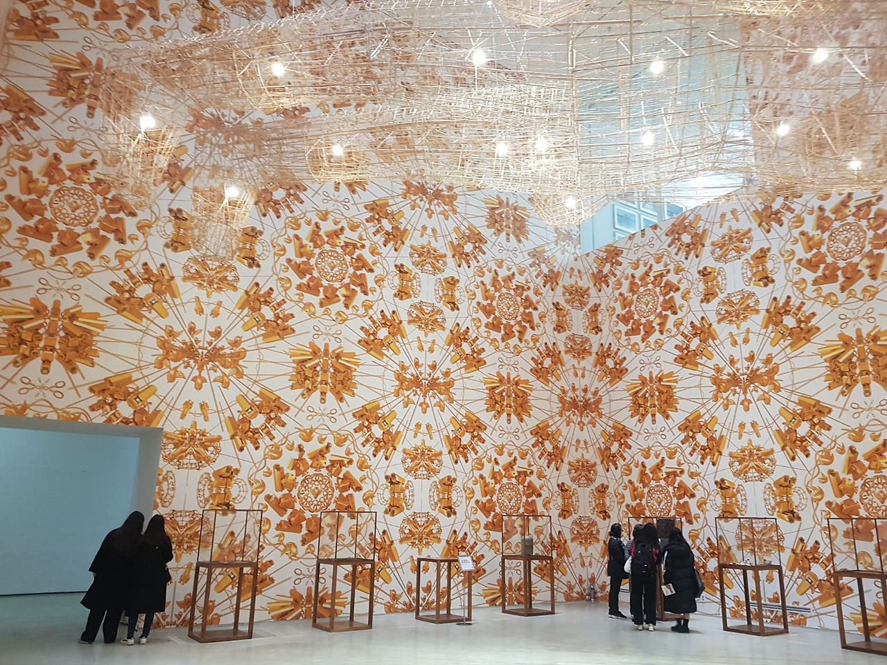 옥의(玉衣)는 한나라 시기에 제왕과 귀족들의 수의였다. 옥이 시신을 썩지 않게 한다고 믿었기 때문에 신분을 상징하는 옥으로 수의를 만들었다. 그러나 전시장의 옥의는 옥이 아닌 대나무로 만들어졌다. 썩어가는 시신을 넣는 자리인 옥의 곳곳은 빛이 난다. 마치 옥의가 조명을 감옥처럼 가둔 것 같다. 이는 위층 유리창에서도 내려다볼 수 있는 구조인데 위에서 보면 더욱 갇혀있는 것처럼 보인다. 우리는 샹들리에에서 볼 수 없었던 빛을 이번 전시장의 옥의 속에서 찾을 수 있다. 옥의를 보기 위해 고개를 들어 천장을 보면 눈이 부셔 제대로 볼 수 없을 정도로 빛이 난다.