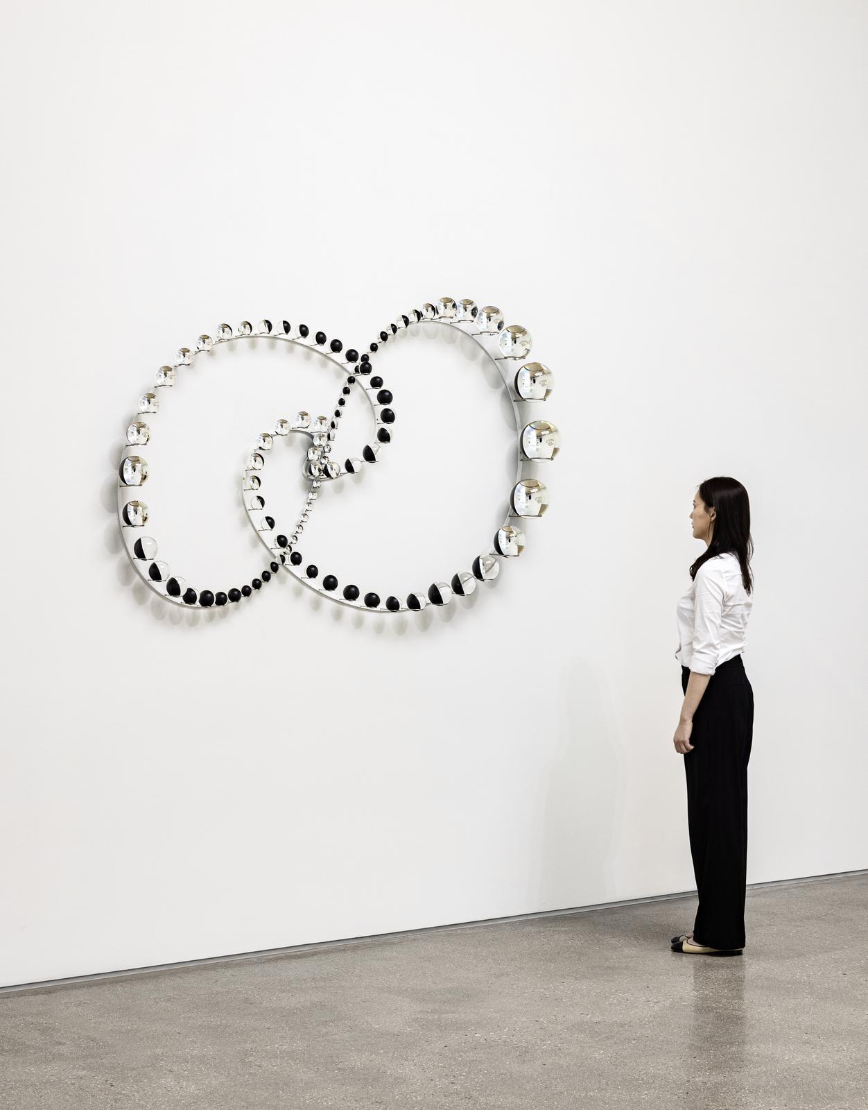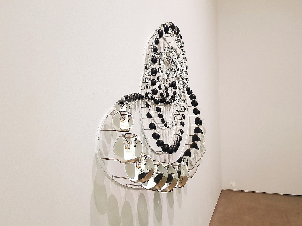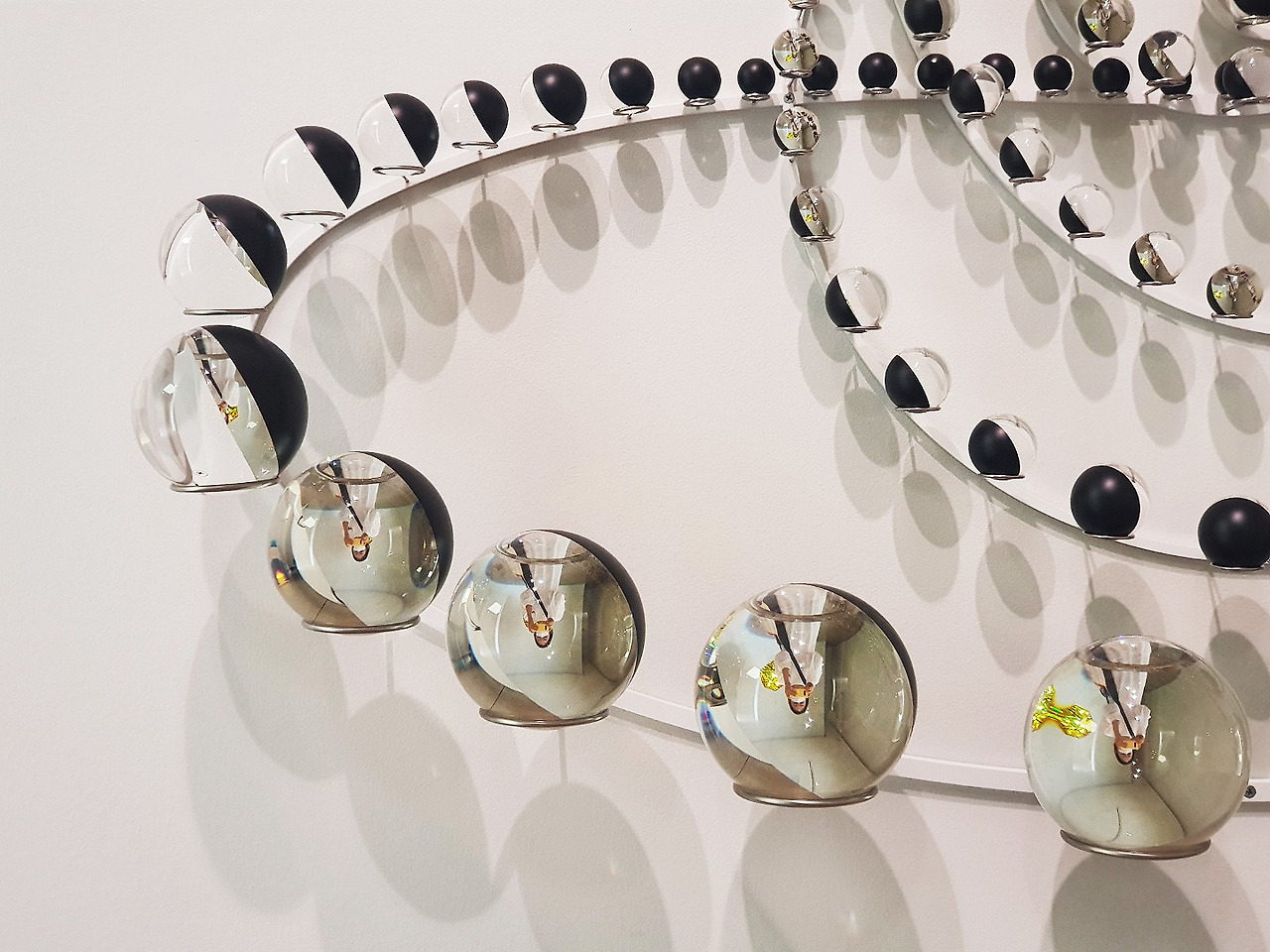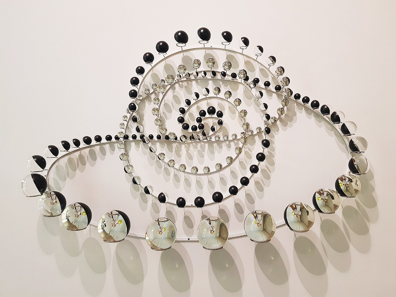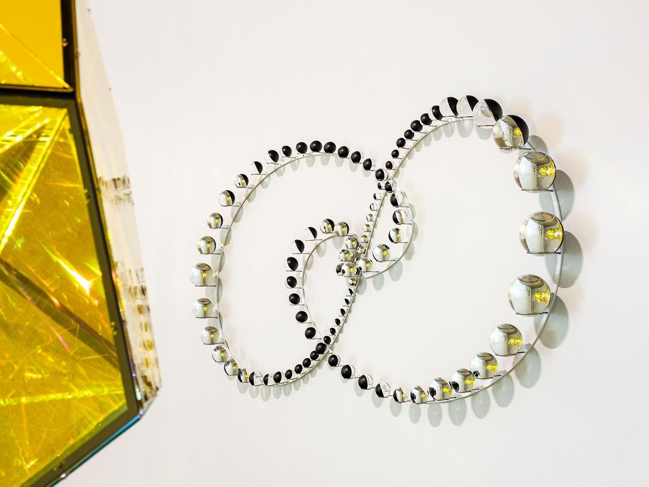 제 1 전시장에 이은 두 번째 시리즈 작품 리뷰다. 제 2 전시장에는 두 가지 유사한 이미지의 벽면 조각과 노란빛을 발산하는 행잉 조각이 있다. 비슷한 두 작품은 변형된 나선형으로 설치된 유리구슬들이다. 각 구슬 면의 절반은 검게 페인트칠되어 있다. 구슬의 각도가 전부 달라 마치 초승달에서 보름달로 변하는 듯 움직임이 느껴진다. 이 투명한 유리구슬들은 관람 중인 관람객을 비춘다. 그리고 유리구슬의 검은 면이 넓어질수록 앞에 서 있는 관람객을 비추는 영역이 좁아져 사라진다.