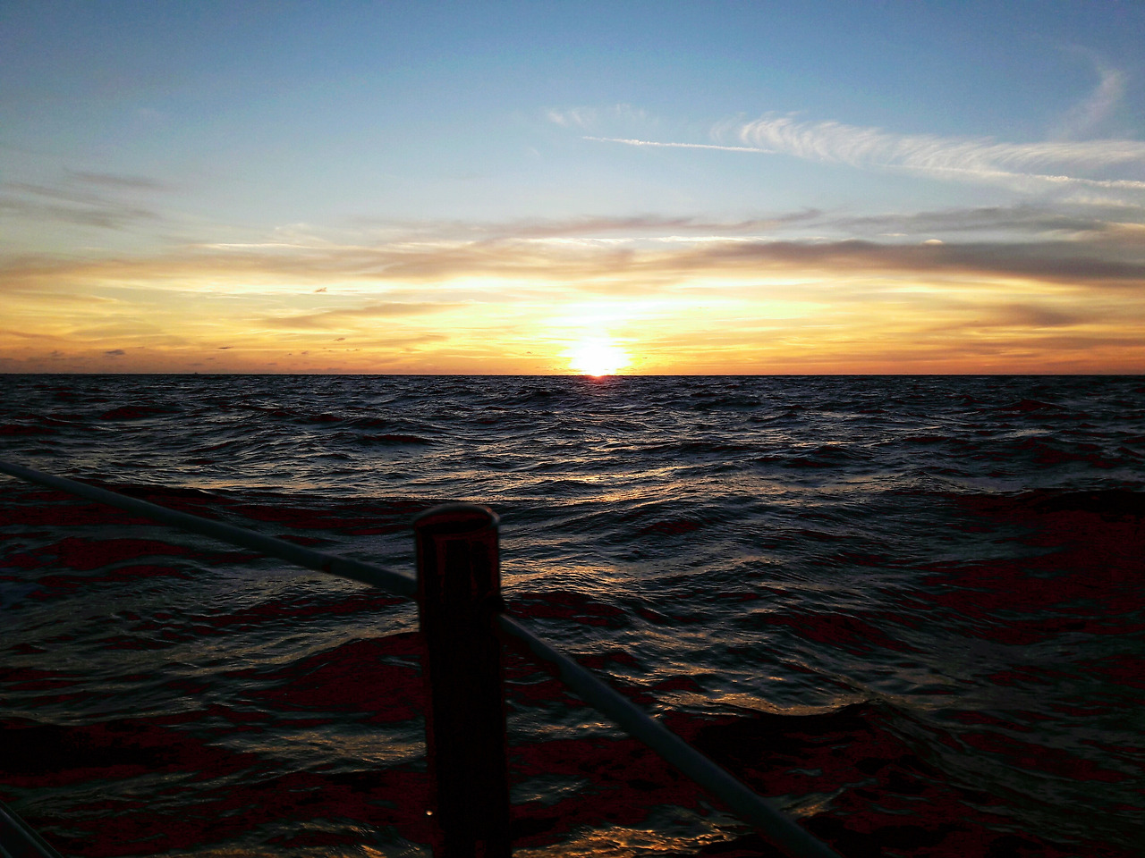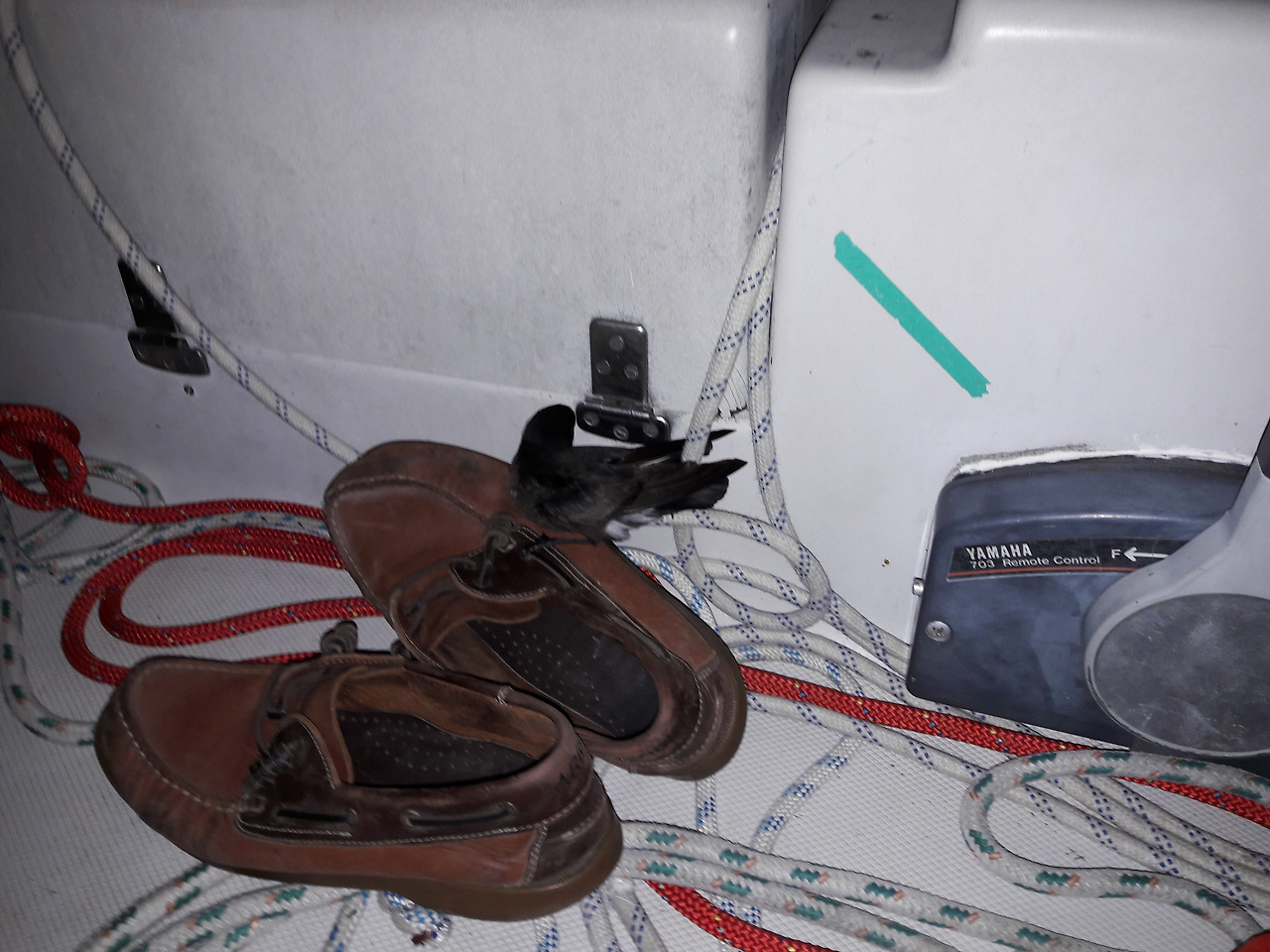 그렇게 잔잔한 파도를 가르며 쉬익 쉬익- 나아가는데 어떤 생명체가 배에 불시착했다. 키를 잡고 선미 조타석에 앉아있던 나를 살짝 스치고 뭔가가 배 안으로 떨어졌고 나는 너무 놀라 소리를 지르기 시작했고 선실에서 자고 있던 바티가 자다가 버선발로 뛰쳐나와 그 비몽사몽한 정신에 같이 소리를 지르며 '무슨 일이야!'라고 했다. 순간 바티는 유조선이 우리 코 앞에라도 있는 줄 알고 정말 죽을만한 상황에 처한 줄 알았다고 한다. 나는 소리만 지르다가 뭐가 배 안에 떨어졌다고 가까스로 말했고 바티가 손전등을 비춰보니 그 범인은 손바닥만 한 작은 새로 밝혀졌다. 한참을 날다가 너무 지친 나머지 우리 배에 바로 탑승하기에 이른 모양이었다. 그 새는 바티의 신발 사이에 자리를 잡고 그 후로 내가 자러 들어가서 깰 때쯤에 다시 푸드덕거리며 날아갔다고 한다. 신발 사이에 똥까지 찍 싸고 갔다.