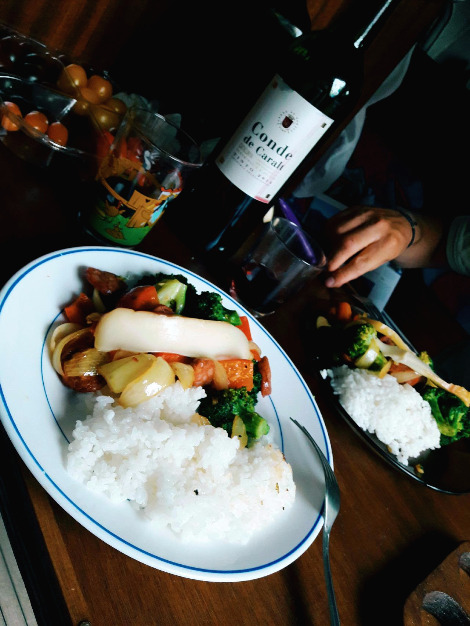 이번에는 버스를 한 번에 제대로 타고 시내로 돌아와 장을 보러 갔다. 시내 한복판에 위치한 작은 마트여서 그랬는지 몰라도 식재료가 프랑스에 비해 덜 풍부하다는 느낌을 받았다. 과일과 야채, 주스 등을 사고 냉장 햄 코너 앞에 멈춰 섰는데 2유로인 잠봉 한 팩을 제외하곤 10유로대로 가격이 뛰는 그 수많은 햄 종류들을 보며 바티가 '그래 여긴 햄 가지곤 장난 안치지 스페인 답네'라고 해서 과연 그렇다며 웃었다. 그렇게 심사숙고해서 고른 햄을 야채와 같이 볶고 그 위에 치즈를 덩이로 잘라 올려 와인과 함께 저녁을 차렸다. 이 날 점심때 사 먹은 것 못지않게 맛있었다.