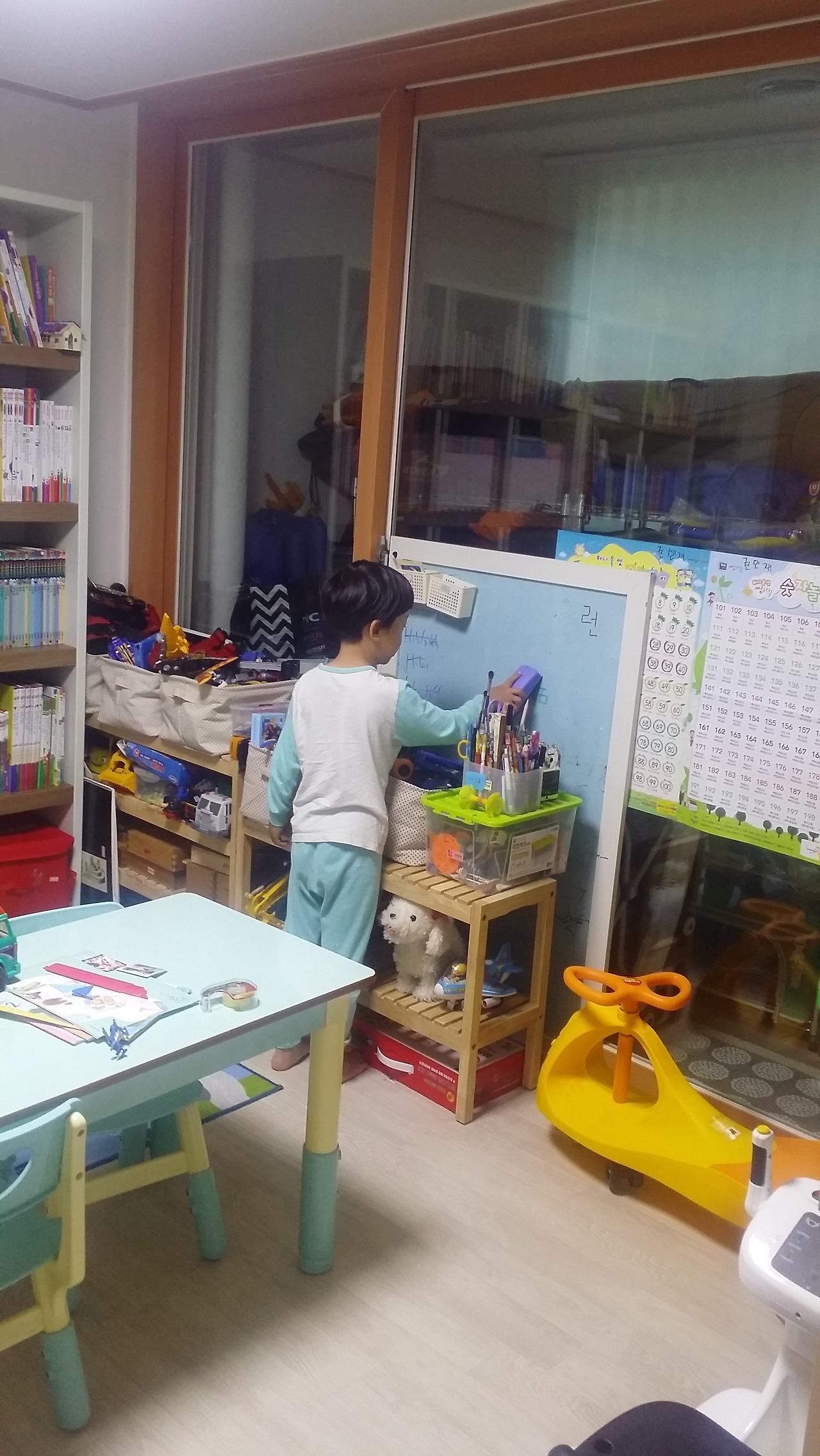 민재가 칠판위에 써놓은 한자를 하나하나 지우며 다시금 중얼거리며 복습을 하고 있는 모습.