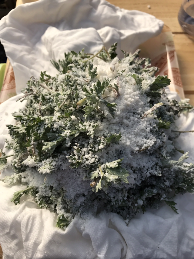 깨끗이 다듬어 씻은 쑥은 햇살 앞으로!