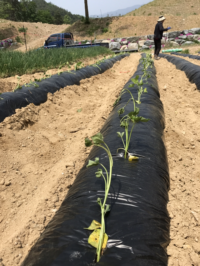 구멍구멍 물 주고... 오후에 한 번 더 수분보충 후 검정비닐의 열기로 순이 타들어가는 것을 막기위해 모종삽으로 흙 보충!