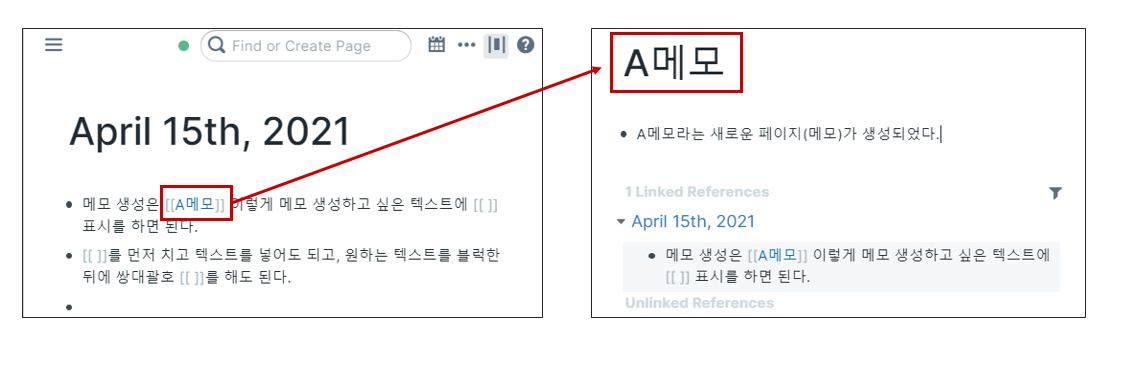 우선 페이지 만드는 방법이 쉽다. 키보드의 대괄호를 두 번 치고 '[[ ]]' 페이지 제목을 넣기만 하면 된다. 메뉴에 들어가 새페이지 생성을 클릭할 필요도 없고, 혹은 어디에 생성할지 폴더 위치를 생각하여 생성할 필요도 없다. 기록을 하던 중에도 [[봄 소풍 계획]]이라는 제목으로 페이지를 만들고 싶다면 '[[ ]] '를 치고 원하는 페이지 제목을 적으면 된다.