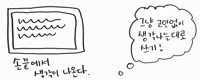 모닝페이지는 누군가에게 보여주기 위함이 아니고 목적 없이 그냥 내 머릿속의 생각을 자유롭게 쓰는 것이다. 생각의 흐름을 적어내면서 내가 어떤 생각을 갖고 있는지 쓰면서 알게 되기도 한다. 글의 구조를 생각하며 어떤 내용을 쓸지 쥐어짜는 것이 아니기에 부담 없이 술술 써진다. 그렇게 쓰다 보면 글감이 솟아난다. 재미있게도 나만 볼 생각으로 쓰는 모닝페이지지만 자유롭게 쓰면서 글감이 되어 세상과 공유할 글로 발전되기도 하는 것이다.