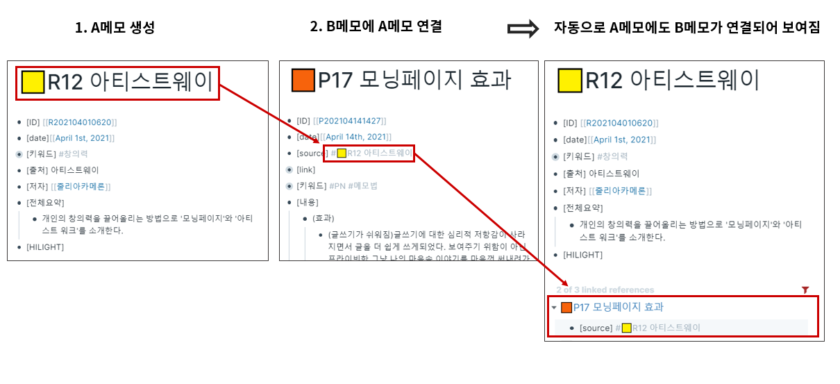 머릿속 생각이 스쳐 그냥 사라지지 않도록 잡아두는 것에서 나아가 각각이 무한대로 연결될 수 있다고 생각되니 아이디어 기록에 강력한 동기부여가 되었다. 지금 하는 기록이 시간이 지나 묵혀 사라지는 것이 아니라 새로운 기록과 연결되어 보이므로 회고할 수 있으며 다른 기록과 만나 새로운 기록을 탄생시킬 수 있다. 나의 모든 기록이 쓸모 있어지는 경험을 할 수 있는 것이다.