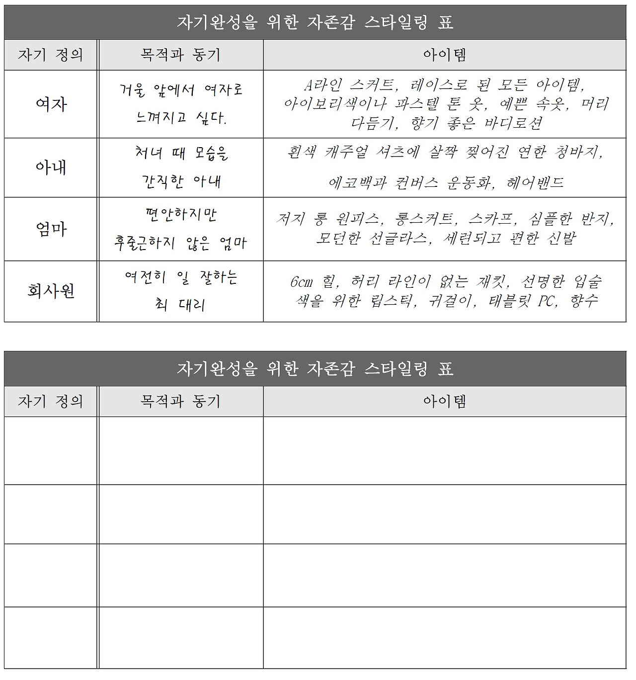 자기완성을 위한 자존감 스타일링 표의 저 아이템들로 옷장을 채우면 좋겠다.