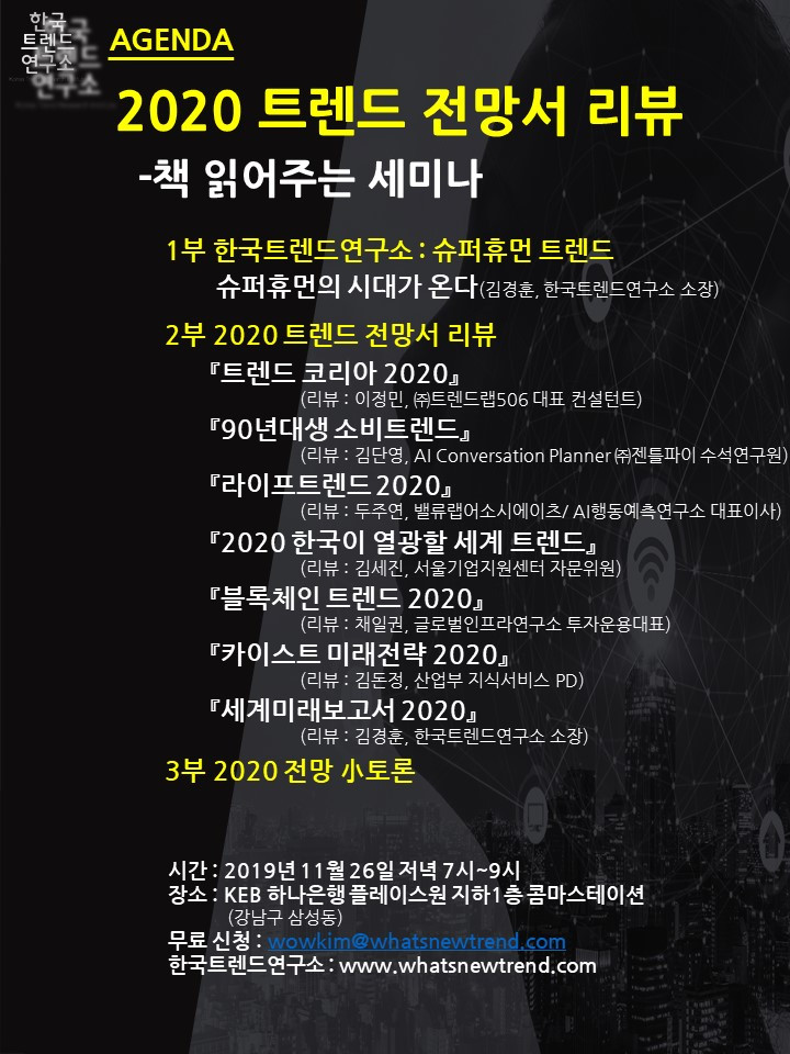 등 이며 한국트렌드연구소 김경훈 소장은 2020 핫트렌드 슈퍼휴먼을 발표한다.