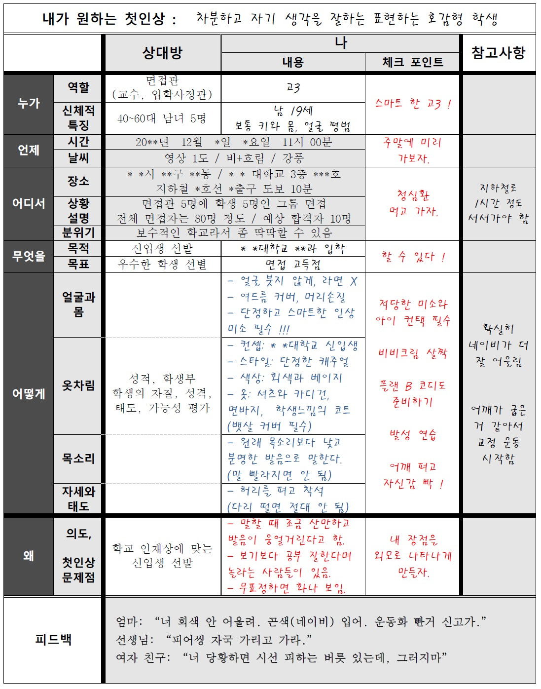 대학 입시 면접을 준비하는 남학생을 예시로 들었다. 멀티 펜으로 쓴 것처럼 중요한 부분인‘나’의 세로열‘어떻게’는 파란색으로 세로열‘왜’와 가로열‘체크 포인트’는 빨간색으로 따로 표기하였다. (실제로 혼감할 때도 이렇게 하면 중요한 부분을 놓치지 않고 체크 할 수 있다)