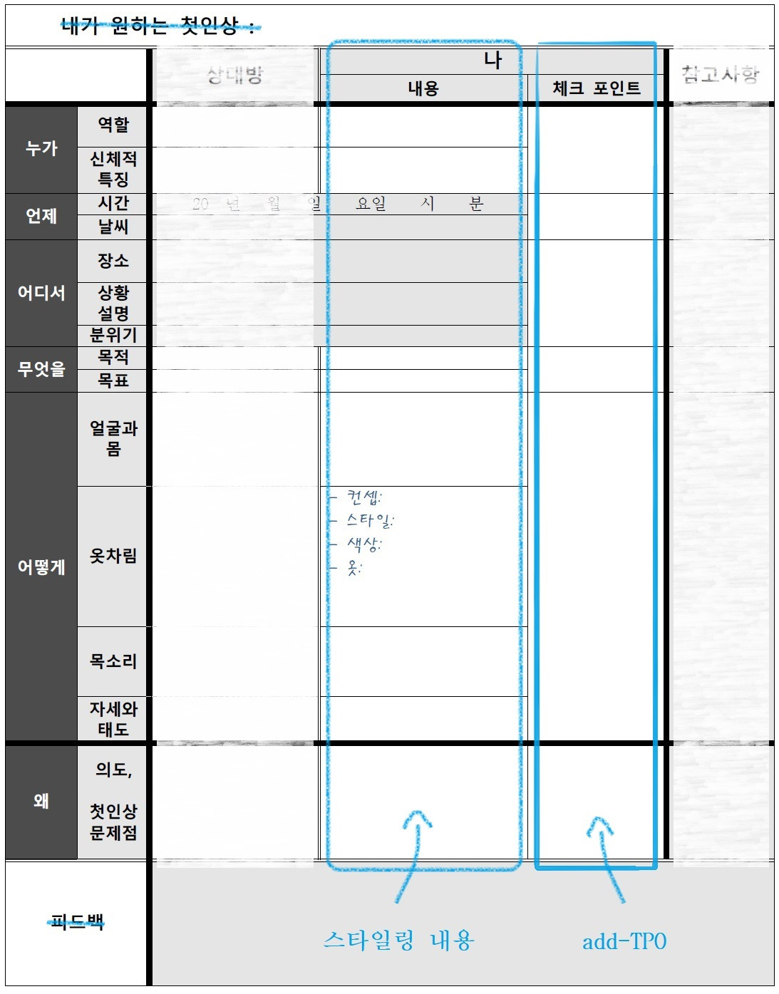 원래 알던 사람들끼리 보는 연례행사나 모임에서 이미지 변신을 하고 싶거나 appearance의 예시인 ‘집 구하기’처럼 당사자를 잘 모를 경우에 쓰면 좋겠다. 그리고 건너뛸 건 ‘라곰(스웨덴어-딱 적당히 알맞게)하게 건너뛰고 ‘나’에 관한 부분 중 ‘내용’에 스타일링을 쓰고 ‘체크 포인트’에 add-TPO를 차례대로 써 넣는다.