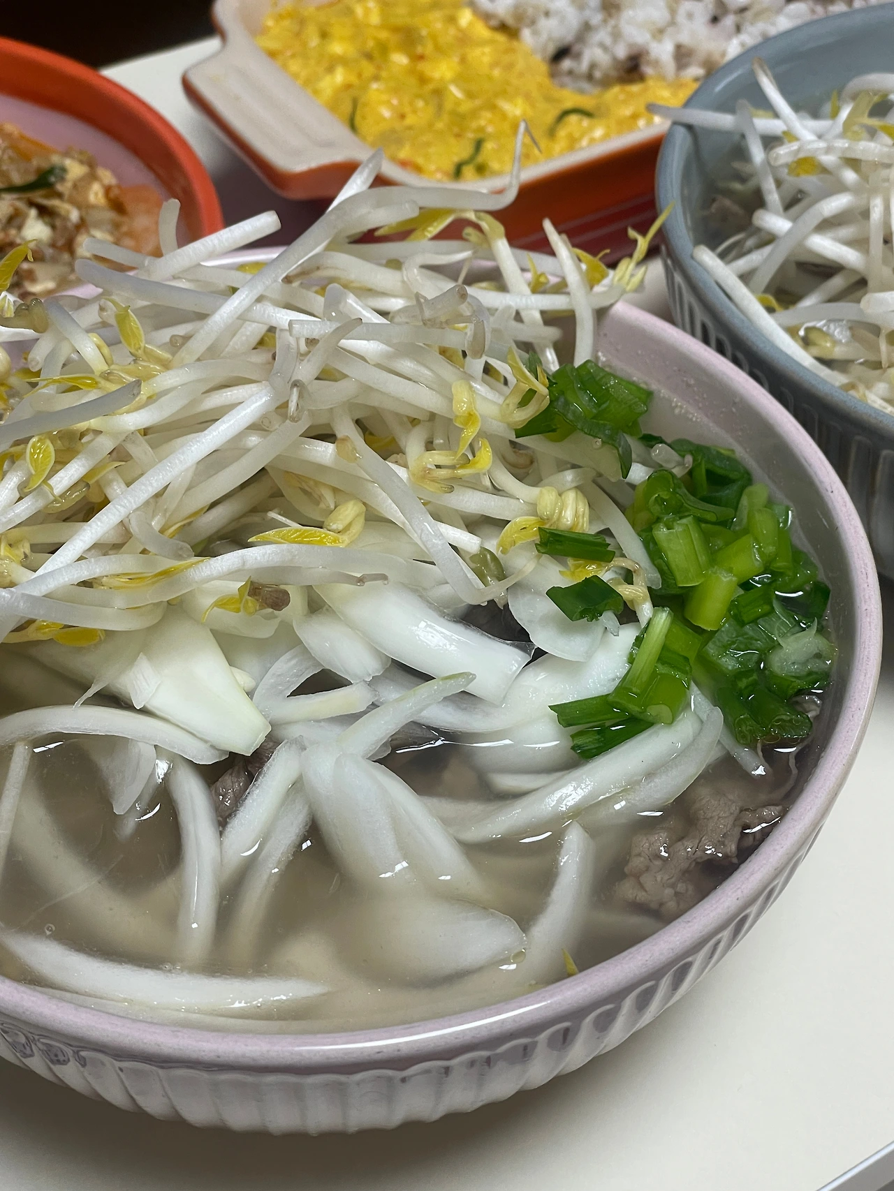 요리할 때 저는 굉장한 성취감을 느껴요. 단순히 밥솥에 불려둔 쌀을 넣고 밥을 짓는 것보다 하나의 메뉴를 완성하면 제가 뭐라도 된 것 같은 기분이 들더라고요. 마트에 가서 베트남에서 직수입한 면과 소스를 사고 양파, 쪽파, 샤브샤브용 고기를 무겁게 사들고 왔고요. 여느 때처럼 유튜브에 검색하며 저에게 맞는 레시피를 하나씩 골라 재료 손질부터 따라 하기 시작했어요.