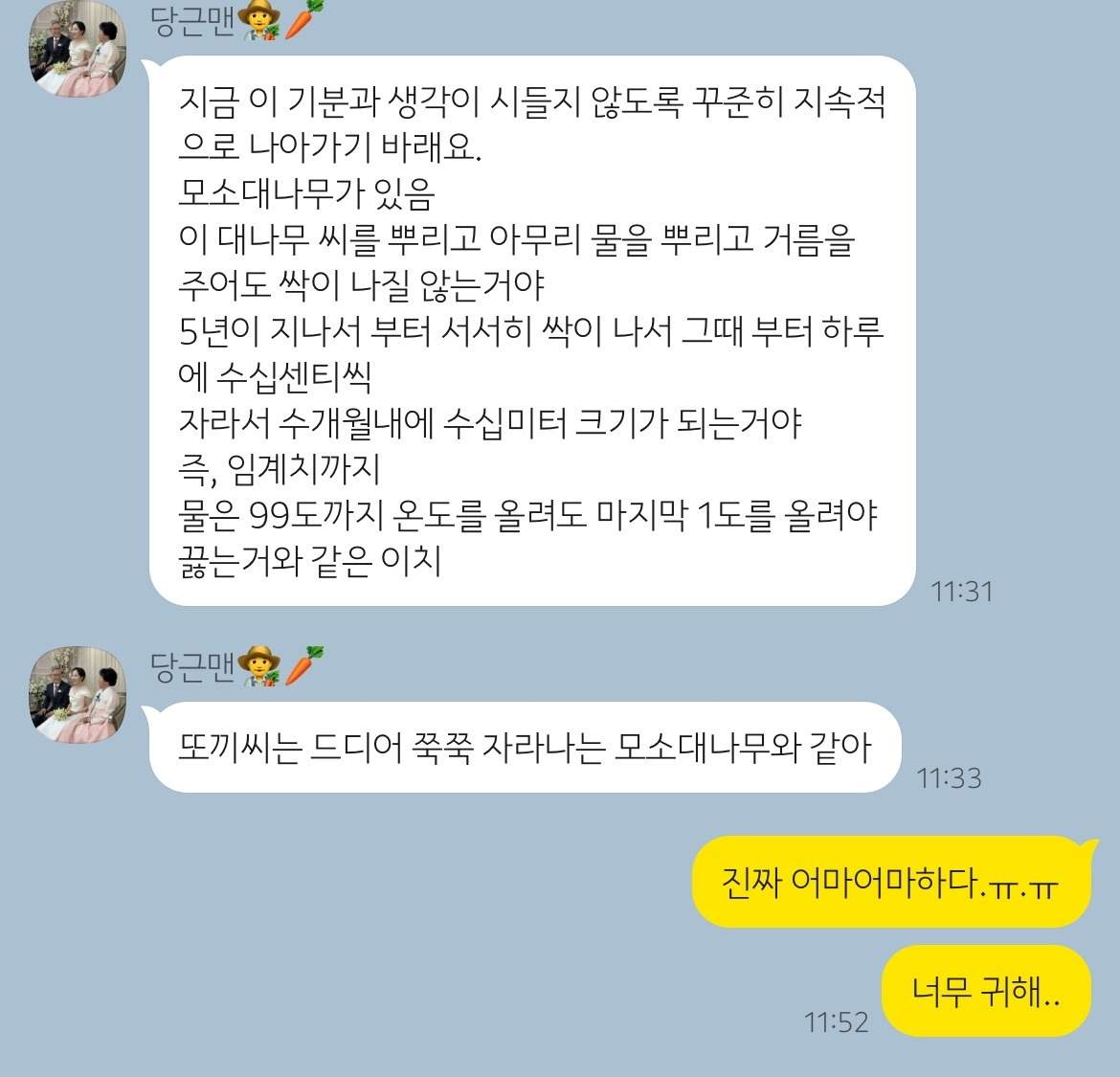 "지금 이 기분과 생각이 시들지 않도록 꾸준히 지속적으로 나아가기 바라요. 모소대나무가 있음. 이 대나무 씨를 뿌리고 아무리 물을 뿌리고 거름을 주어도 싹이 나질 않는 거야. 5년이 지나서부터 서서히 싹이 나서 그때부터 하루에 수십 센티씩 자라서 수개월내에 수십 미터 크기가 되는 거야. 즉, 임계치까지 물은 99도까지 온도를 올려도 마지막 1도를 올려야 끓는 거와 같은 이치. 또끼씨는 드디어 쭉쭉 자라나는 모소대나무와 같아."