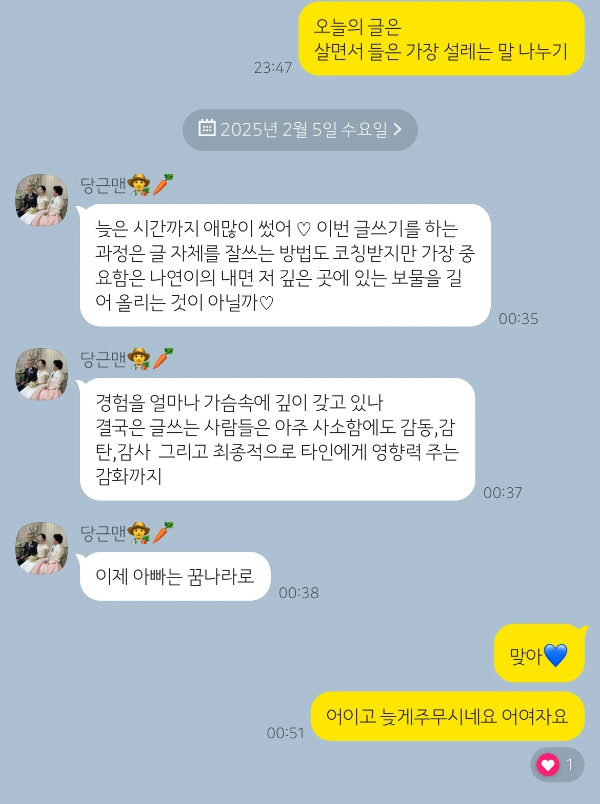 늦은 시간까지 애 많이 썼어. 이번 글쓰기를 하는 과정은 글 자체를 잘 쓰는 방법도 코칭받지만 가장 중 요함은 나연이의 내면 저 깊은 곳에 있는 보물을 길어 올리는 것이 아닐까?