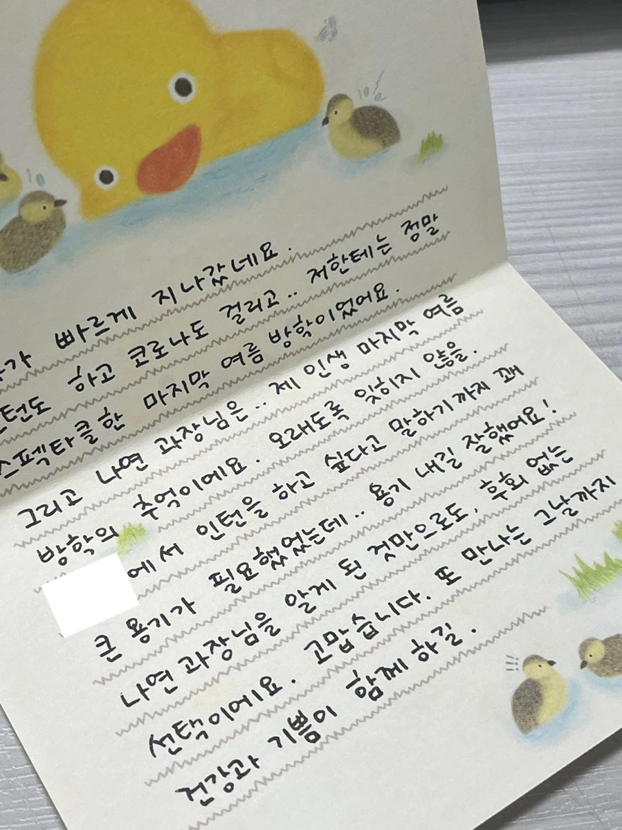 오래도록 잊히지 않을. **에서 인턴을 하고 싶다고 말하기까지 꽤 큰 용기가 필요했었는데.. 용기 내일 잘했어요! 나연 과장님을 알게 된 것만으로도 후회 없는 선택이에요.