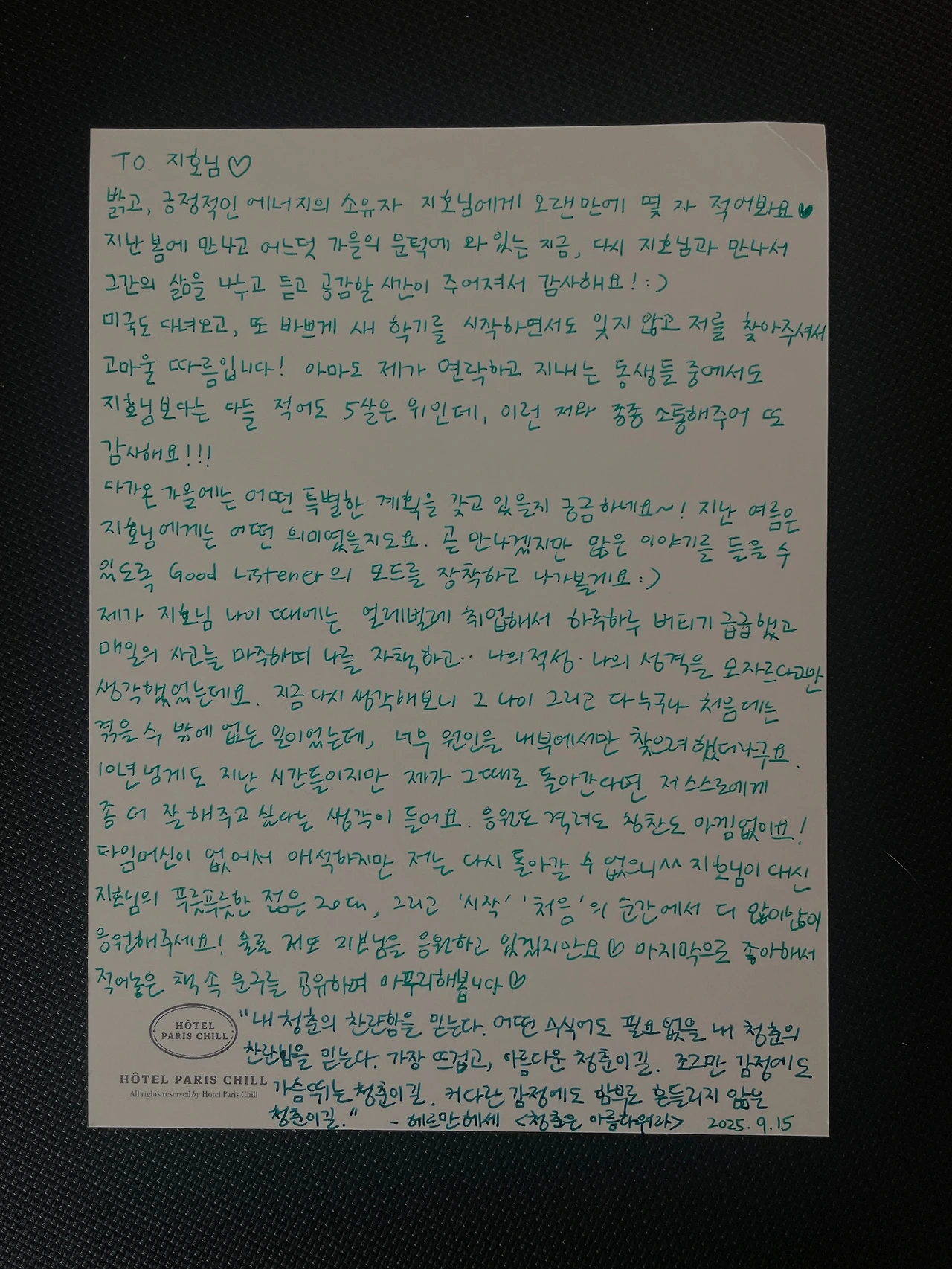 밝고 긍정적인 에너지의 소유자 지호님에게 오랜만에 몇 자 적어봐요.