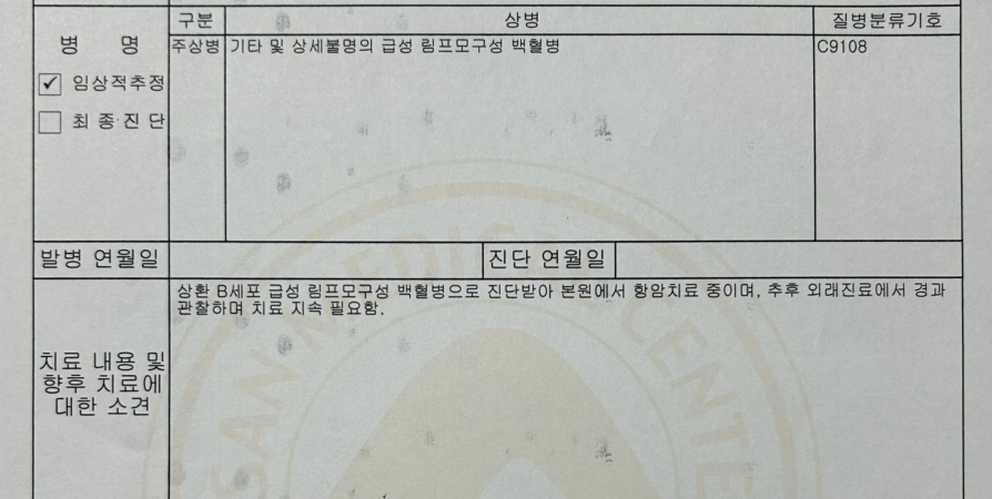 급성 림프모구성 백혈병은 골수에서 정상 백혈구가 악성 세포로 변해 말초 혈액으로 퍼지는 혈액암이다. 정상 혈구 생성을 방해해 면역력이 급격히 떨어지며, 간·비장·뼈·림프절을 침범하면 장기가 붓고 뼈에 통증이 생긴다. 셋째가 토하고 어지러워했던 이유, 외상이 없는데도 밤마다 아파했던 이유를 그제야 알았다.