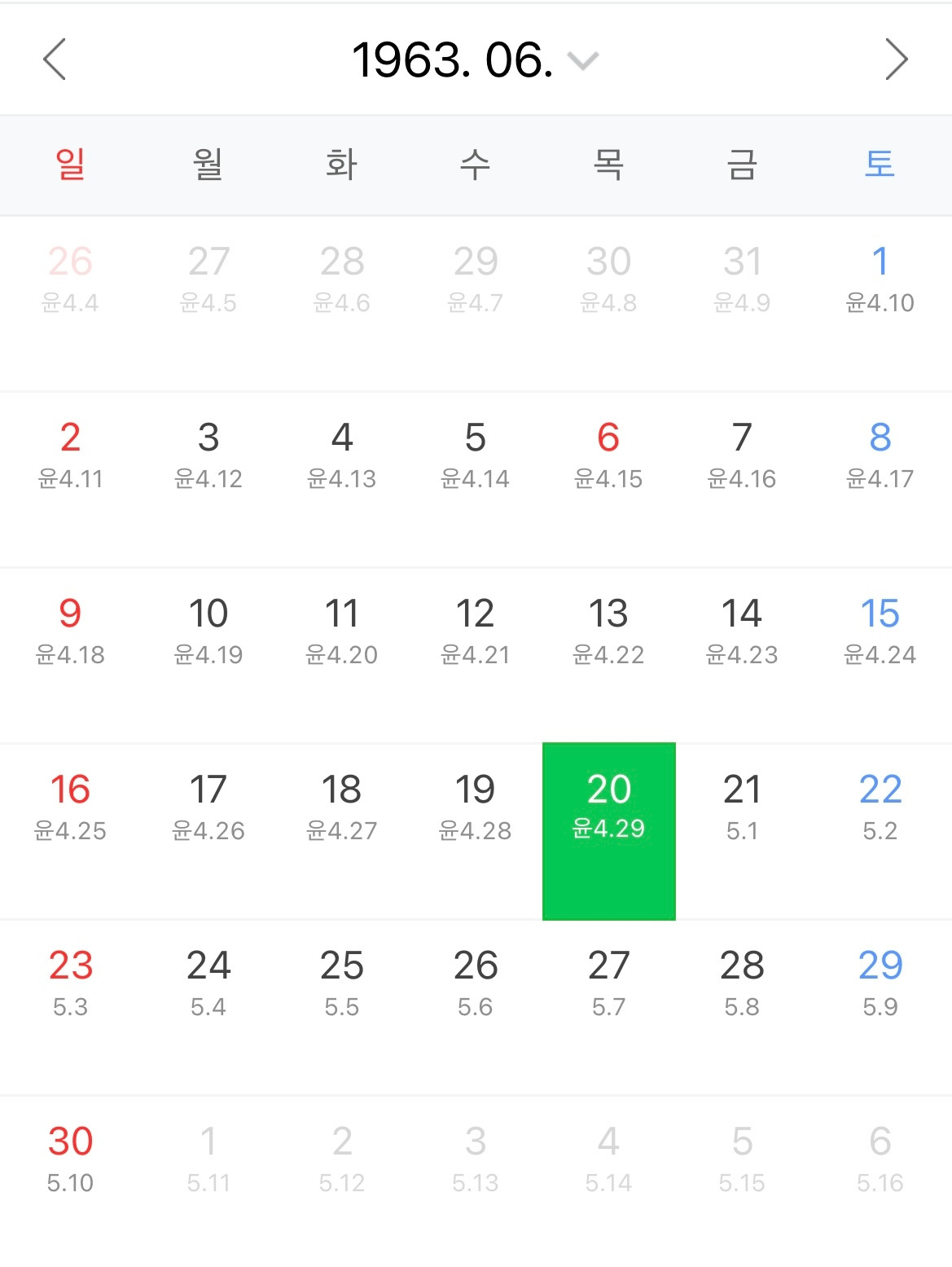 이 주사님께서도 한 10년 전쯤 호기심 반, 궁금함 반으로 천문대에 문의도 해 보았다고 하셨다. 돌아온 답변은 진짜 생일을 찾아먹을 수 없으니 1963년 당시 윤 4월 29일에 해당되는 양력 6월 20일을 그냥 생일로 하는 수밖에 없다고 했단다.