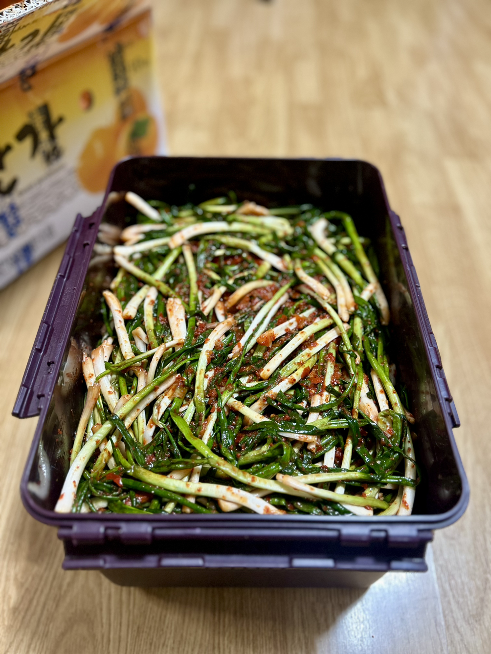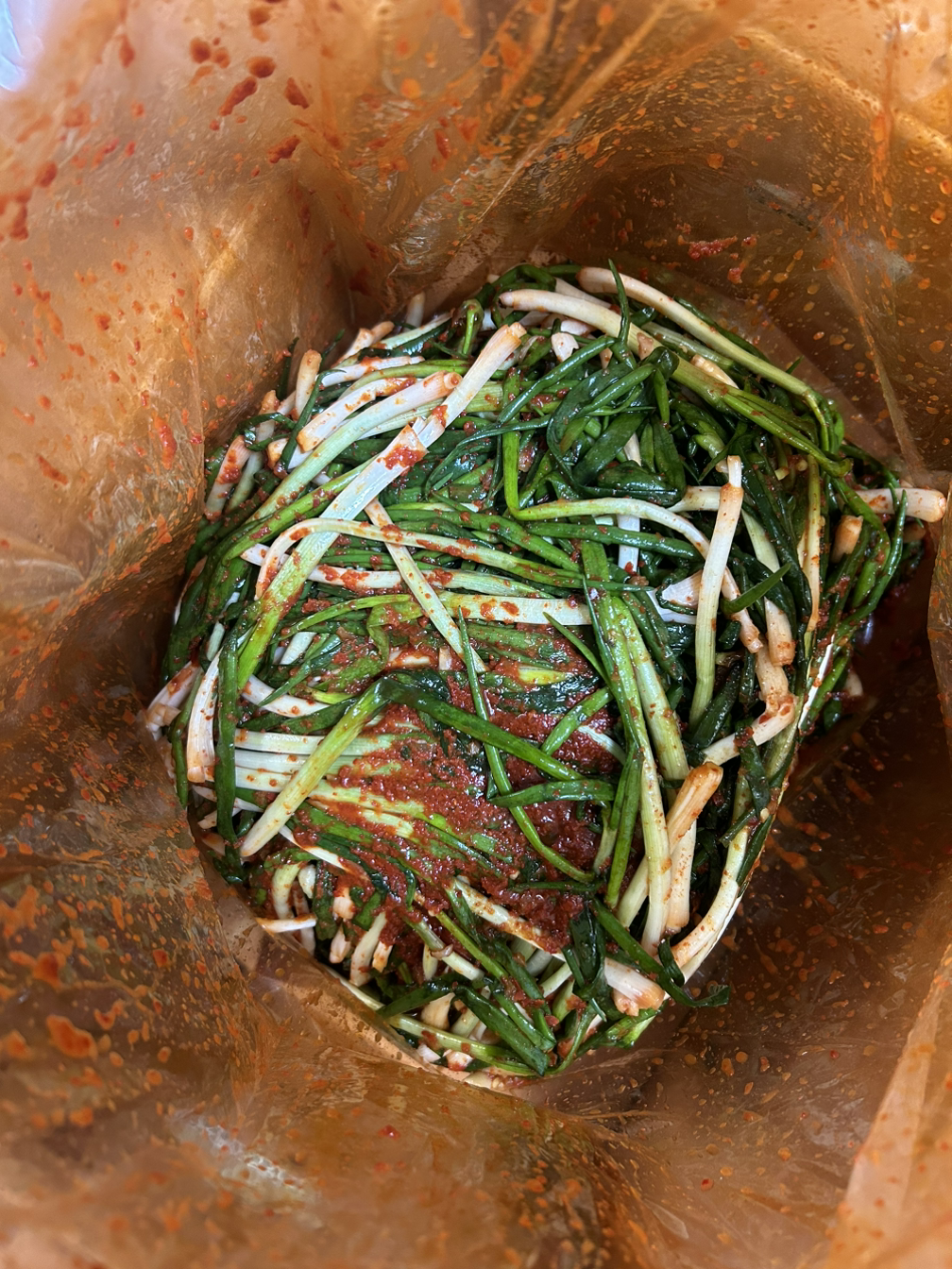 이렇게나 많이... 이걸 다 다듬으신 생각을 하니 김치를 값으로 매겼을 때 비싸다는 생각을 절대 할 수가 없다. 소비자 입장에서는 비싸다고 생각 들겠지만 이건 기계로 다듬을 수 있는 게 아니다. 다 수작업이지. 대량으로 김치를 다루는 곳보다 더 깨끗하게 다듬고 씻어서 양념까지 모두 다 농사 지어 좋은 것으로만 만든 파김치다. 공들인 정성과 시간, 가치로만 따지면 고가인데 값을 함부로 매길 수가 없다. 백화점에 납품하는 값비싼 김치보다도 우리 엄마 김치가 최고다. 대통령도 이런 김치는 못 먹어보셨을걸!