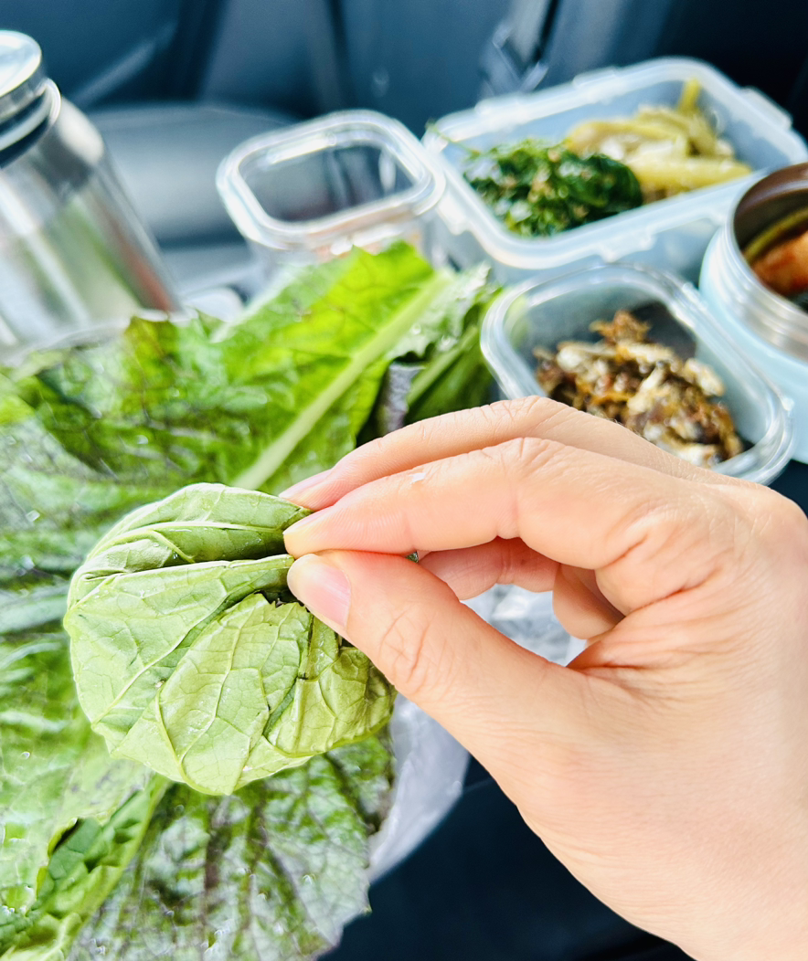 삼겹살 먹을 때도 상추 한 장, 적겨자잎 한 장 겹쳐서 싸면 맛이 훨씬 더 좋다.