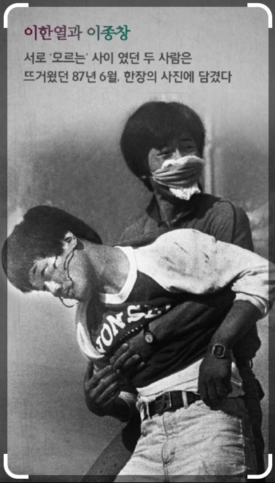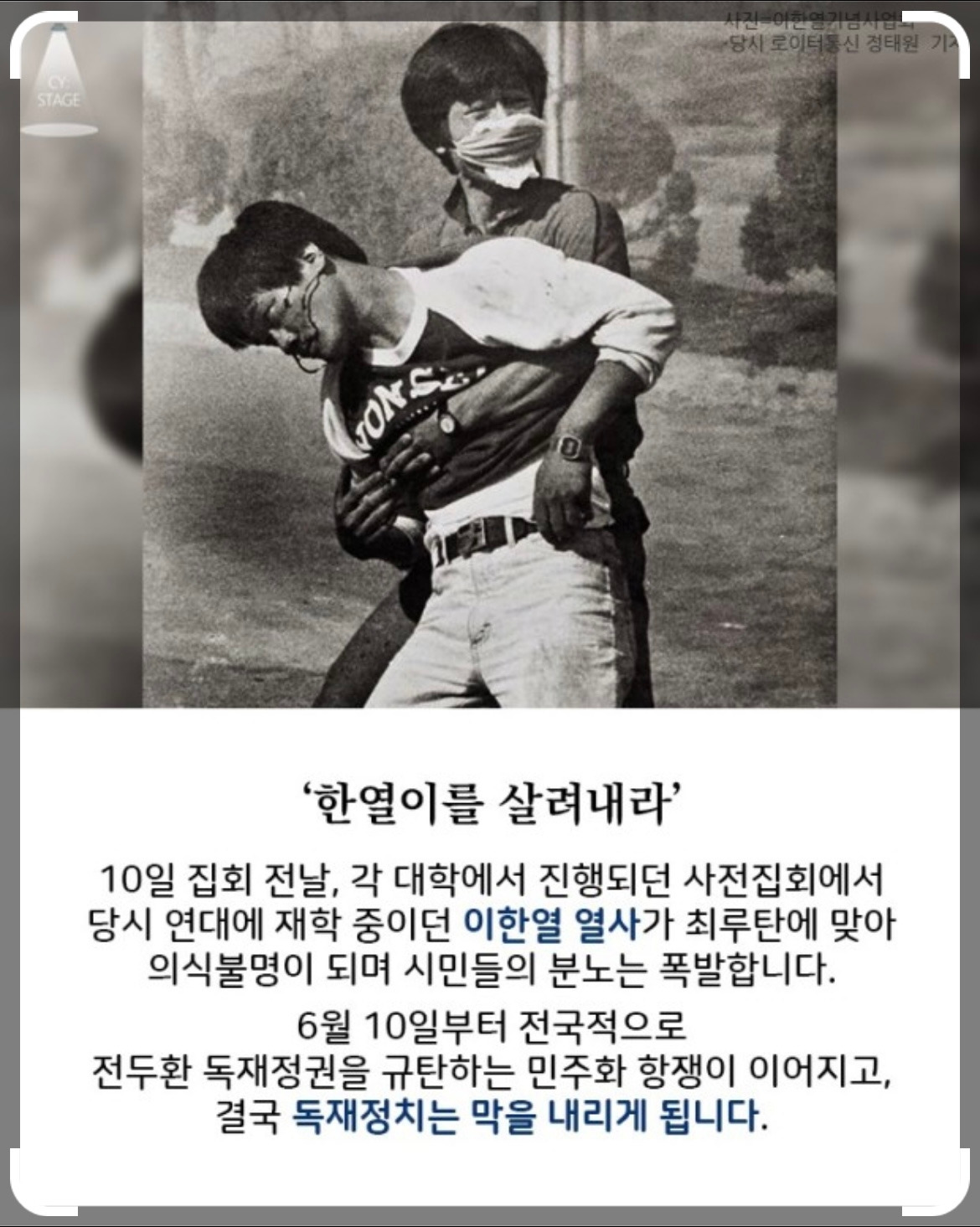 (한편, 머리에 최루탄을 맞아 쓰러진 이한열 열사는 27일간 사경을 헤매다 안타깝게도 결국 1987년 7월 5일 세상을 떠났습니다.)