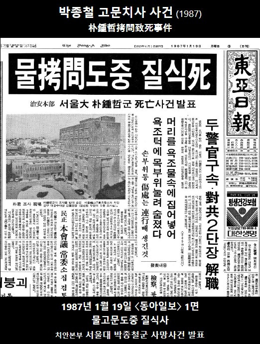 어제 낮 12시쯤 서울시 용산구 갈월동 치안본부 대공분실에서 조사를 받던 서울대학교 언어학과 21살(만 나이) 박종철 군이 갑자기 쓰러져 병원으로 옮기다가 숨졌습니다. 숨진 박 군은 서울대 민민투 책임자로서 수배 중인 사회복지학과 박종운 군을 숨겨준 혐의로 어제 오전 경찰에 연행됐었습니다.