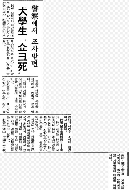 이렇게 해서 1월 15일 오후 3시 30분 중앙일보 사회면에 '경찰에서 조사받던 대학생 쇼크사'라는 2단 기사가 석간에 단신으로 실려 국내 언론과 외국 언론에서도 인용되었고, KBS와 MBC 저녁 뉴스에서도 단신으로 내보냈습니다.