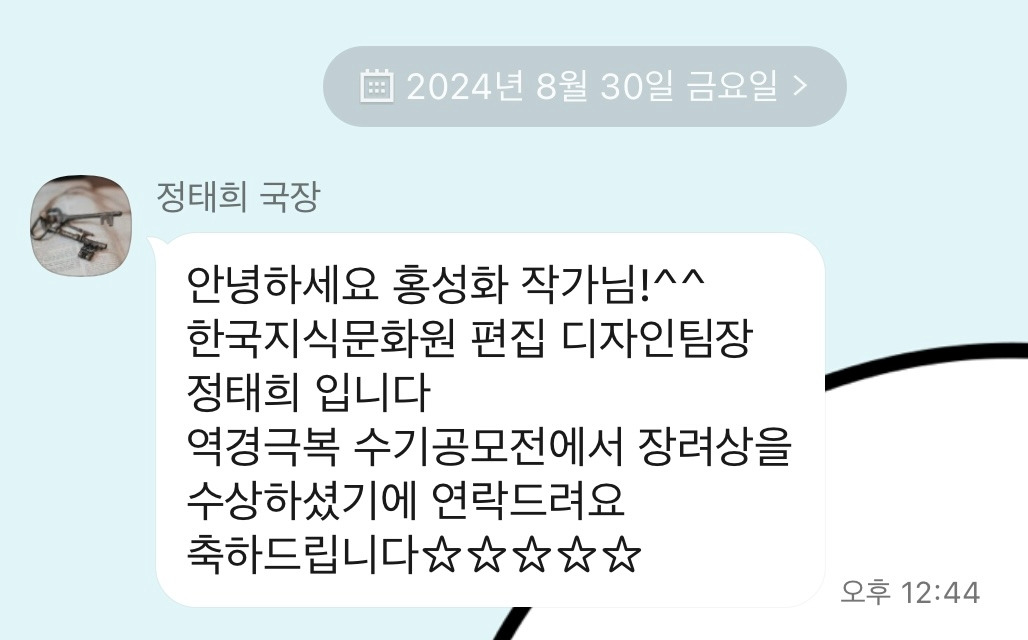 그리고 그 이야기를 7페이지로 축소시켜 최근에 알게 된 '역경 극복 수기' 공모전에 내보냈다. 기대도 안하고 있었는데 지난주 금요일에 결과가 빨리 나왔다.