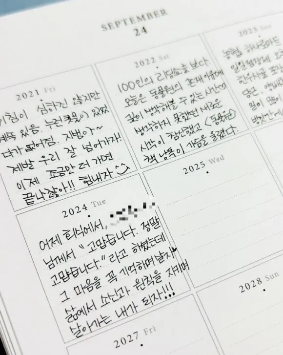 10년 다이어리는 종이 한쪽에 같은 날의 하루가 10칸으로 나누어져 있다.