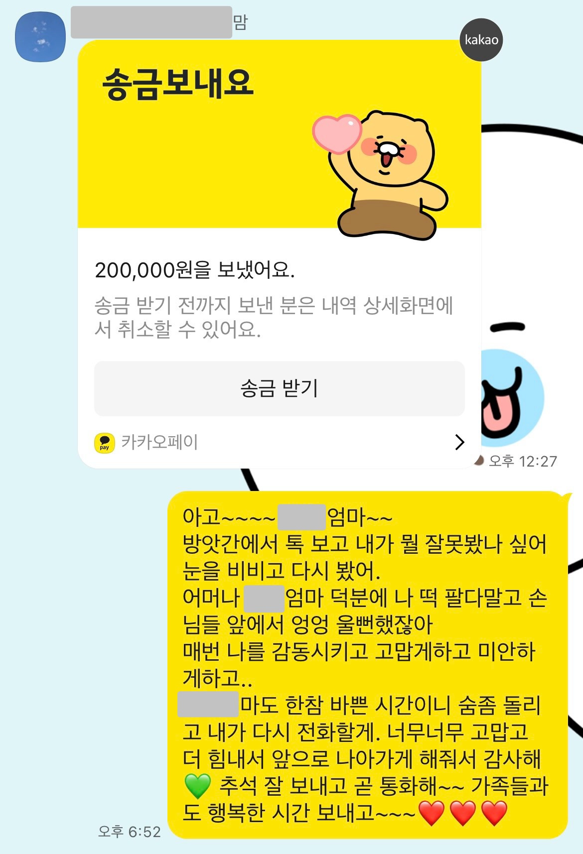 시부모님 떡방앗간에서 추석 전날 대목 장사를 하고 있었고 무심결에 본 톡이라 눈을 비비고 다시 볼만큼 놀랐다. 손님들 앞에서 순간 울컥했고 엉엉 울뻔했다.