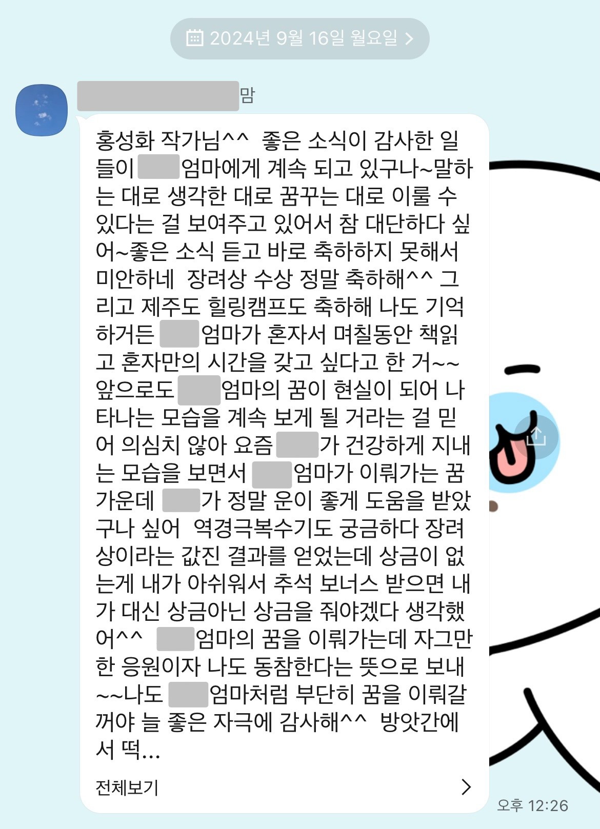 그렇지만 아무리 가까운 사이라도 어떻게 20만 원씩이나 보낼 생각을 다했는지... 장려상이라 비록 상금은 없지만 종이책으로 나온다기에 난 얼마나 설레고 행복했는지 모른다. 책이 발행된다는 특전 한 가지만으로도 더 바랄 게 없었다. 진심이었다. 그랬는데 ○○엄마가 상금이라며 보내준 금일봉을 받고 어안이 벙벙했었다.