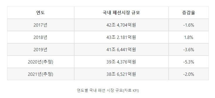 KFI에 따르면 2017년 42조 4,704억(-1.6%)에서 2018년 43조 2,181억으로 1.8% 소폭 회복됐던 패션 시장이 2019년(2019년 3월~2020년 2월 기준) 41조 6,441억 원으로 3.6% 감소한 것으로 조사됐다. 올해 역시 코로나 19의 영향으로 인해 전년 대비 39조 4,376억원을, 포스트 코로나 시대로 접어드는 내년에는 38조원까지 하락할 것으로 예상했다.