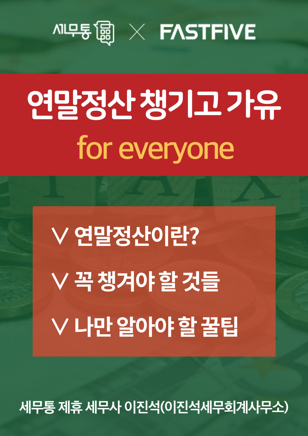 이번 주 수요일 (12/11) 패스트파이브에서는 세무통과 함께하는 연말정산 강의도 준비되어 있는데요! 해도 해도 헷갈리는 연말정산까지 챙기고 가세요!